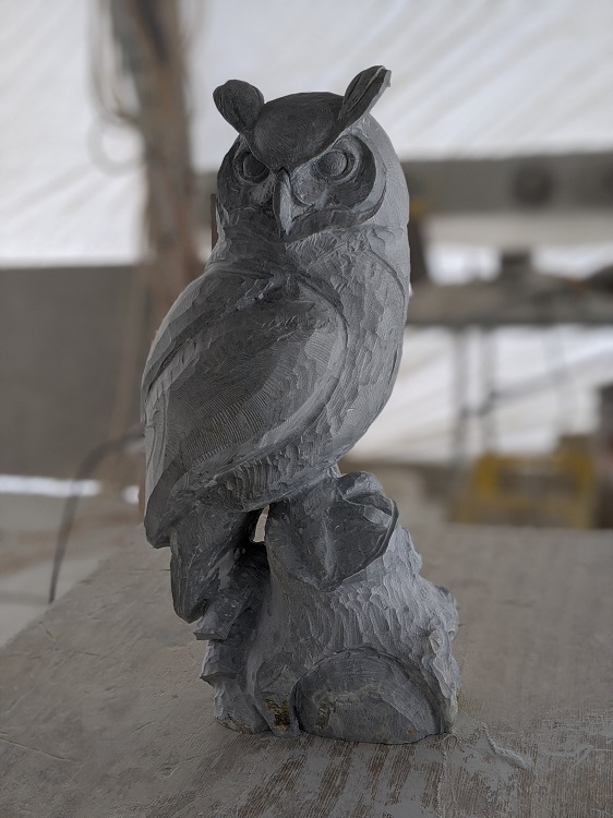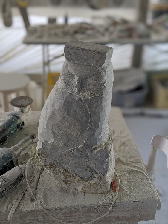 Back in the studio, now with an owl in mind, I realized if I flipped the color-plus stone I selected for the walking grizzly bear up on end it would actually work for this owl piece I was envisioning. I wondered how much time it would actually take to carve this. Each piece I carve has this time-money relationship embedded into it. By now I have learned how long a bear will take to carve but with new animals this time-estimation process is not as refined. So there was a bit of an x-factor regarding time when it came to carving this owl.