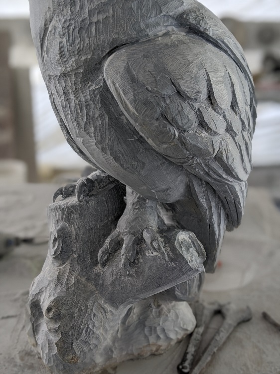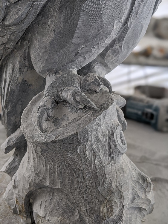 With the design of this piece I wanted to create an asymmetrical design with the feet. I really liked how versatile the owls feet and tallons are when clutching onto whatever branch or stump it is resting on. So with my piece I decided to push one foot down while pulling the other one up positioning it on a slight angle. I felt it was quite successful and the feet ended up being one of my favorite aspects of this carving. Its quite interesting how sometimes the most subtle shifts in how I pose the animal, weather it’s the slight turning of the head or angle of the feet often add so much to the final artwork.