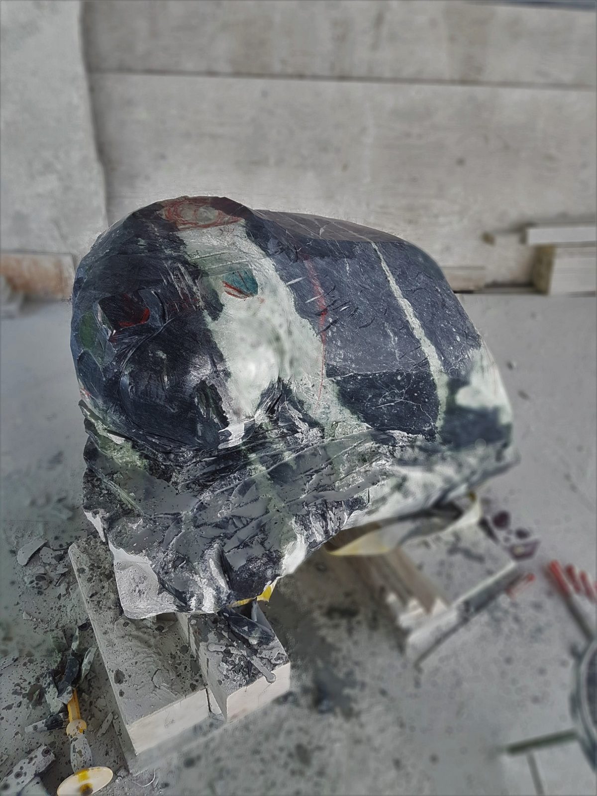 Through the years I have developed the methodology “letting the stone do what it’s going to do” this mostly regarding the coloration of the stone. I have found ways to utilize the unique colorations in stone to support and enhance my design but also just letting it do what it’s going to do, and in this allowing for some unexpected events to occur or surprises, if you will, when it comes to the unique color of the final form.