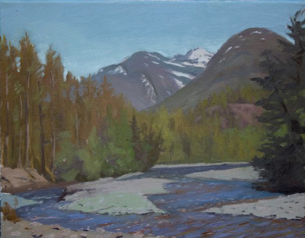 This was the second painting of the day. Lately I have been doing a painting in the morning and a painting in the afternoon. Sometimes with the afternoon painting I am already warmed up in terms of being able to see my colors so I was looking forward to getting set up and seeing what I could come up with. Each new painting is a challenge with no certain outcome. Though with practice I hope to create the ability to complete more paintings successfully. This was a new spot for me. It was quite a cool experience as I walked through the trees out onto the expansive river bed. I wondered if I might see a bear today. There was a slight breeze sweeping across the rocks which prompted to me to make sure my canvas was well secure into my easel. It was the hottest day yet this spring! I made sure to have a proper hat this time to avoid another sunburn which I had gotten a few days previous.