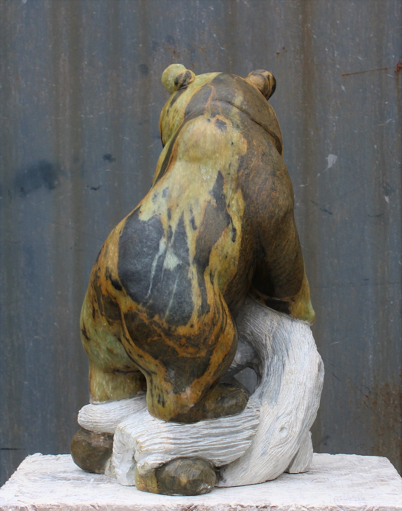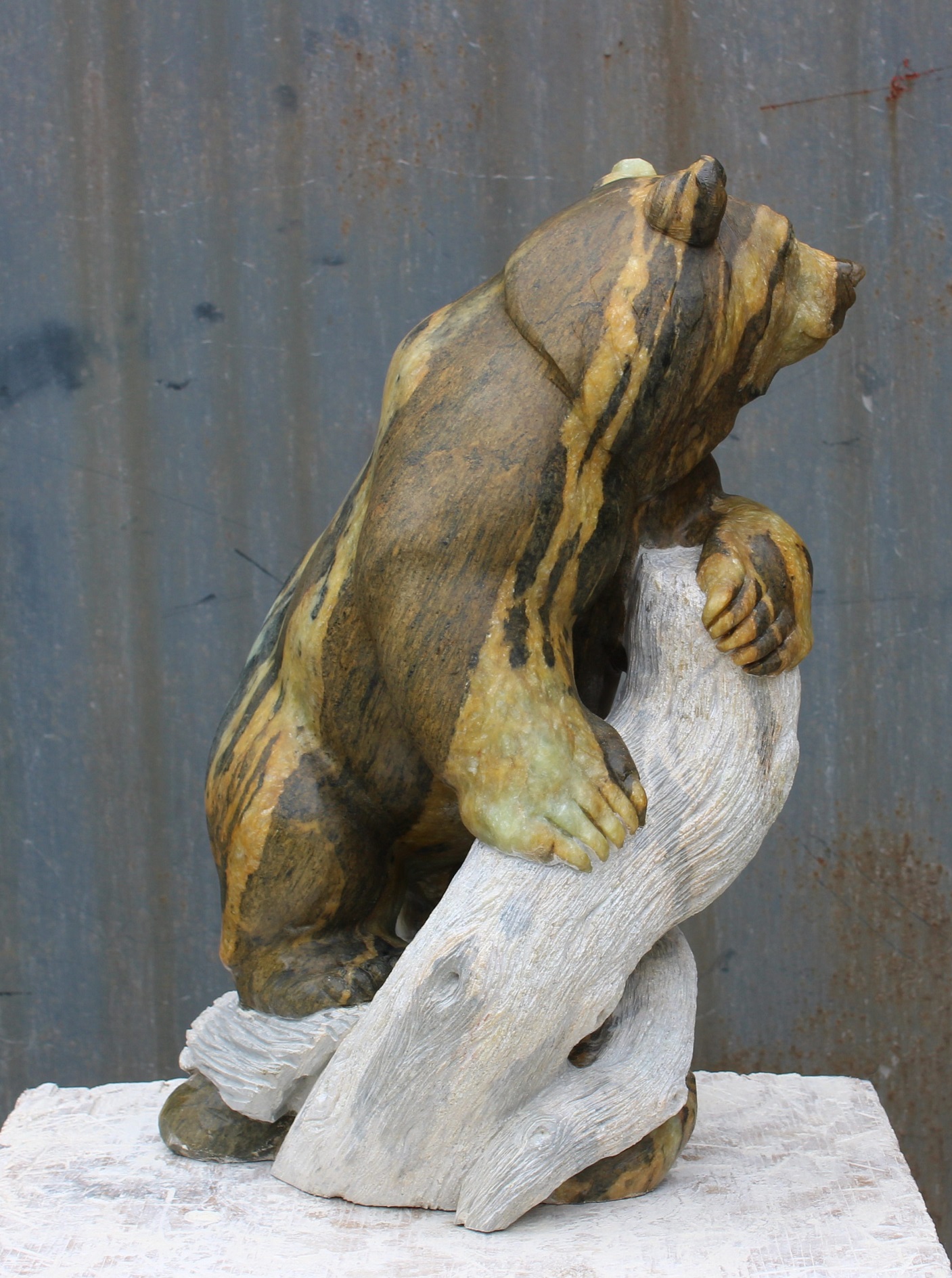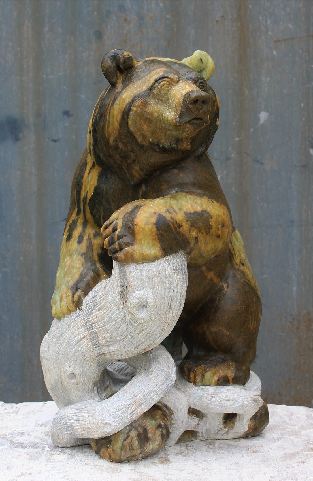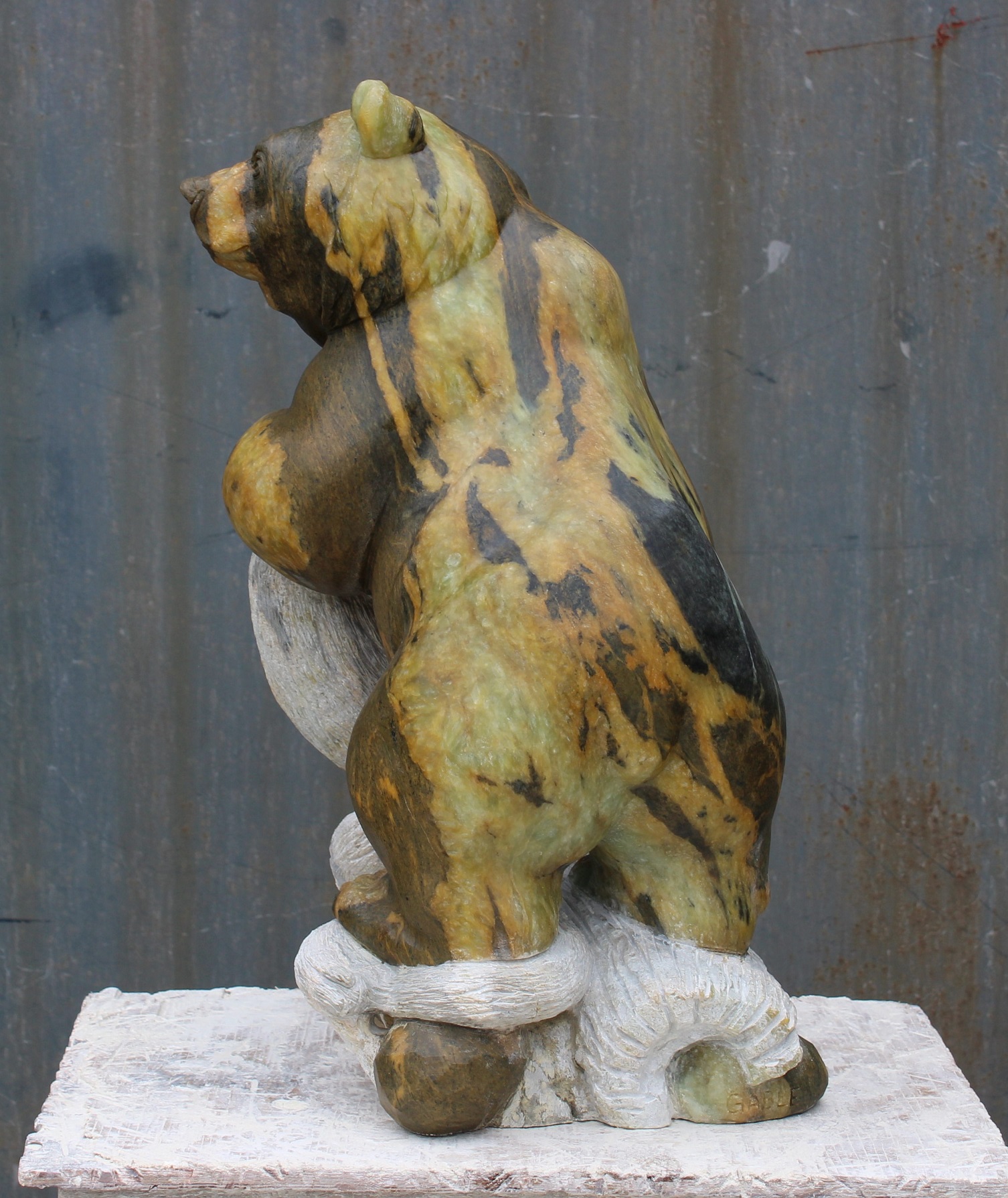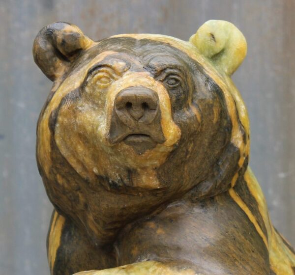 Animal: Grizzly Bear on Logs Stone Type: Soapstone Weight: 80lb Dimensions: 20(H) x 12(L) x 10(W) *SOLD