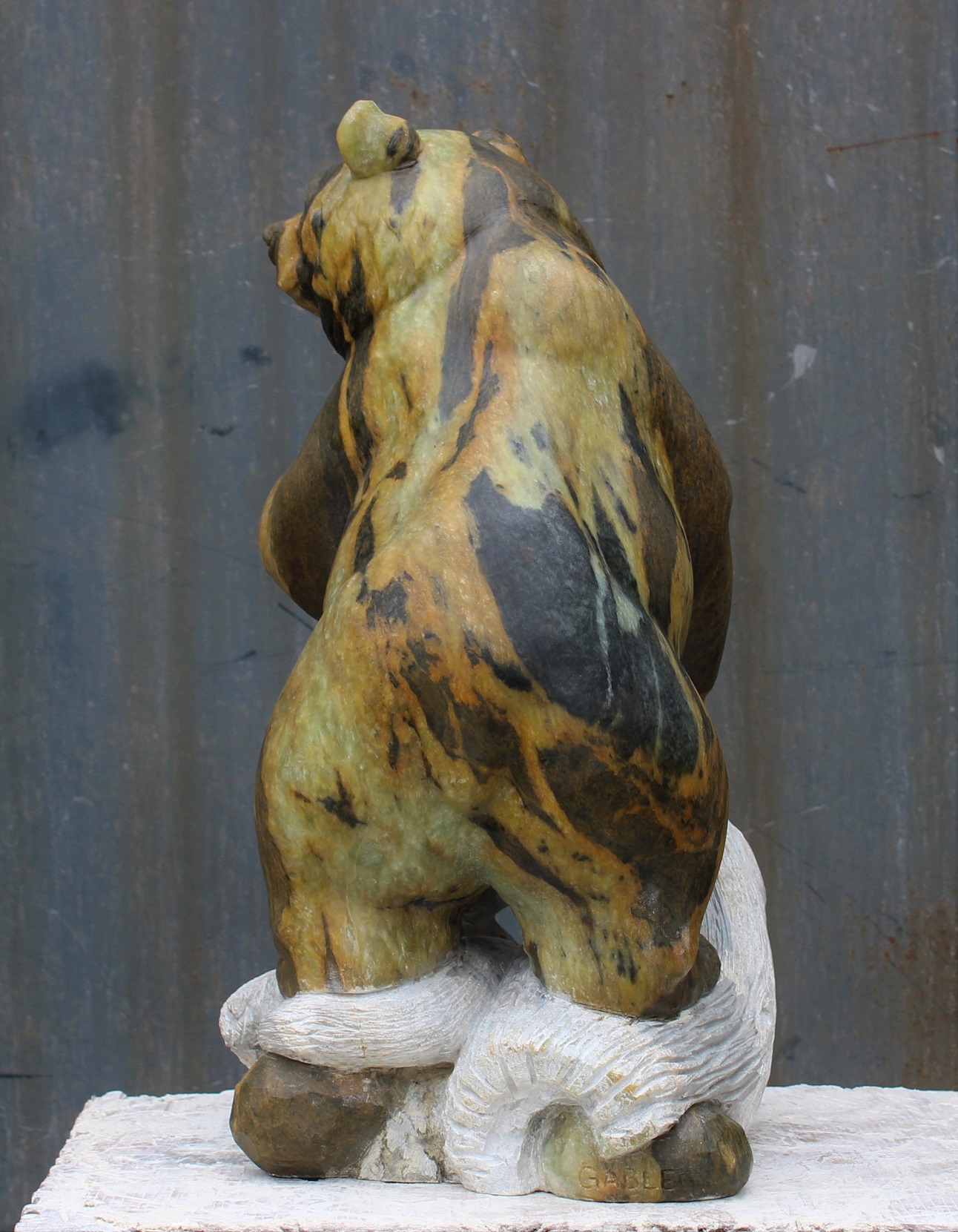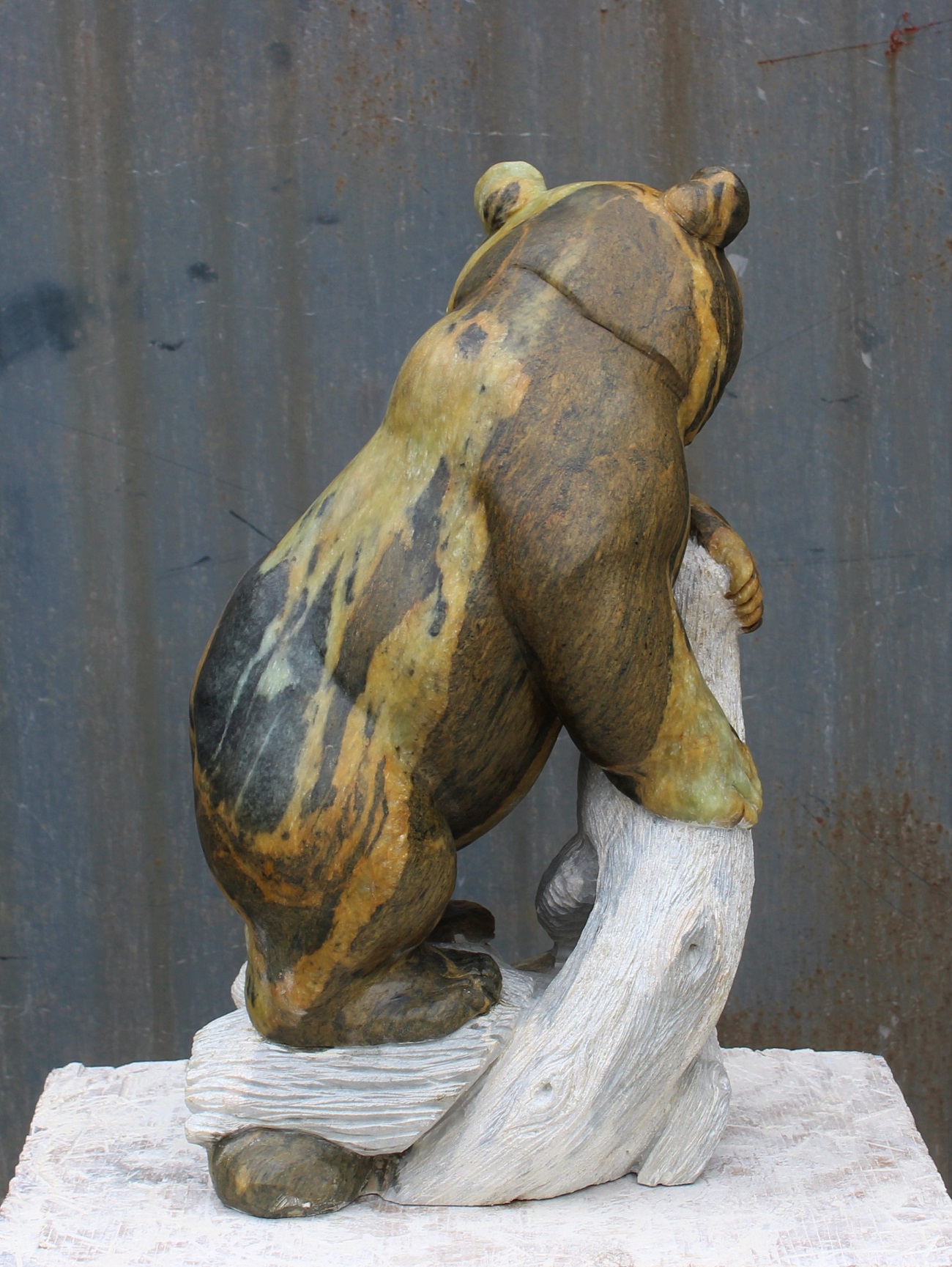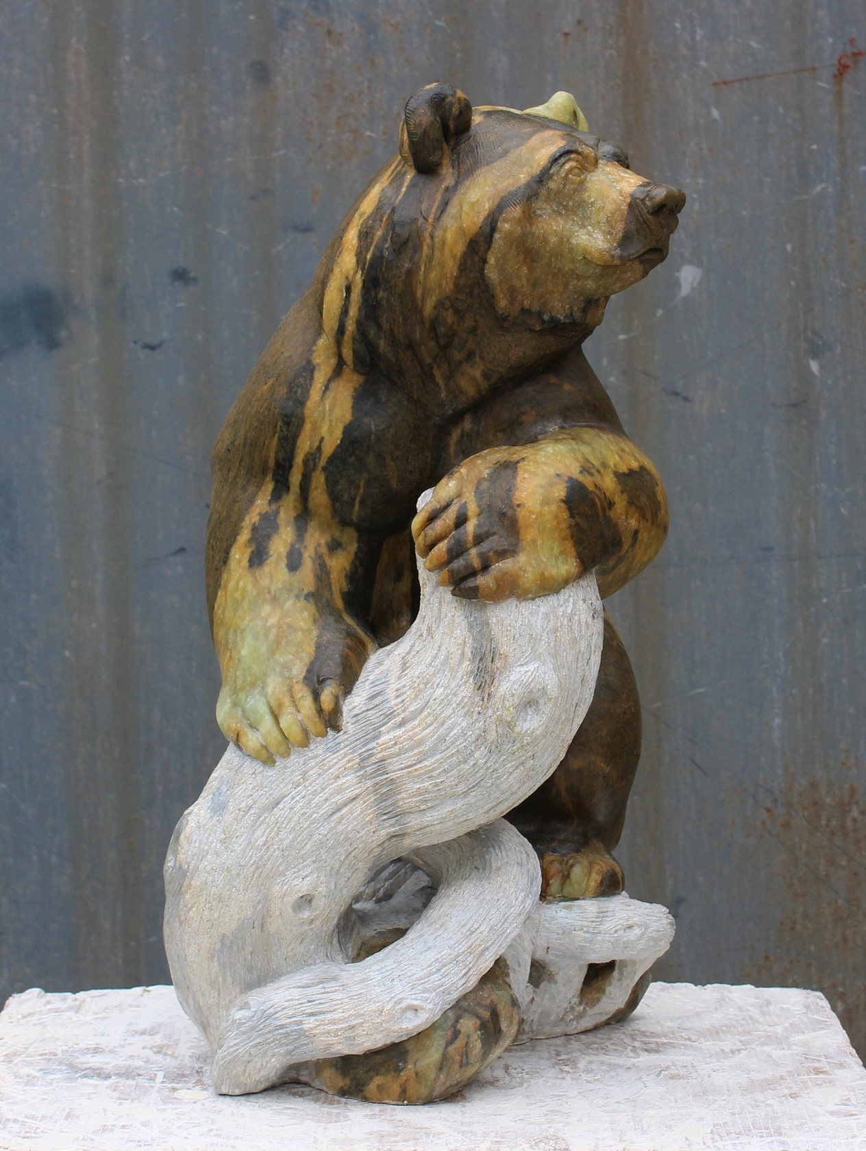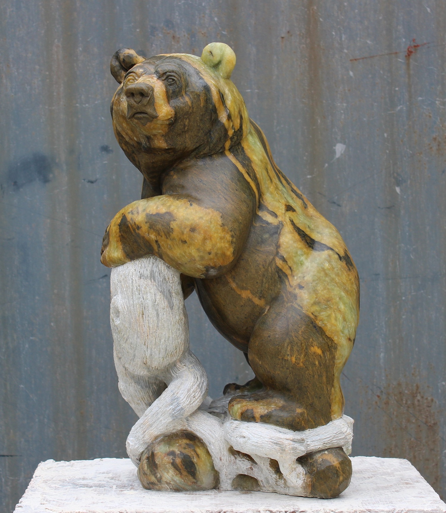 Animal: Grizzly Bear on Logs Stone Type: Soapstone Weight: 80lb Dimensions: 20(H) x 12(L) x 10(W) *SOLD
