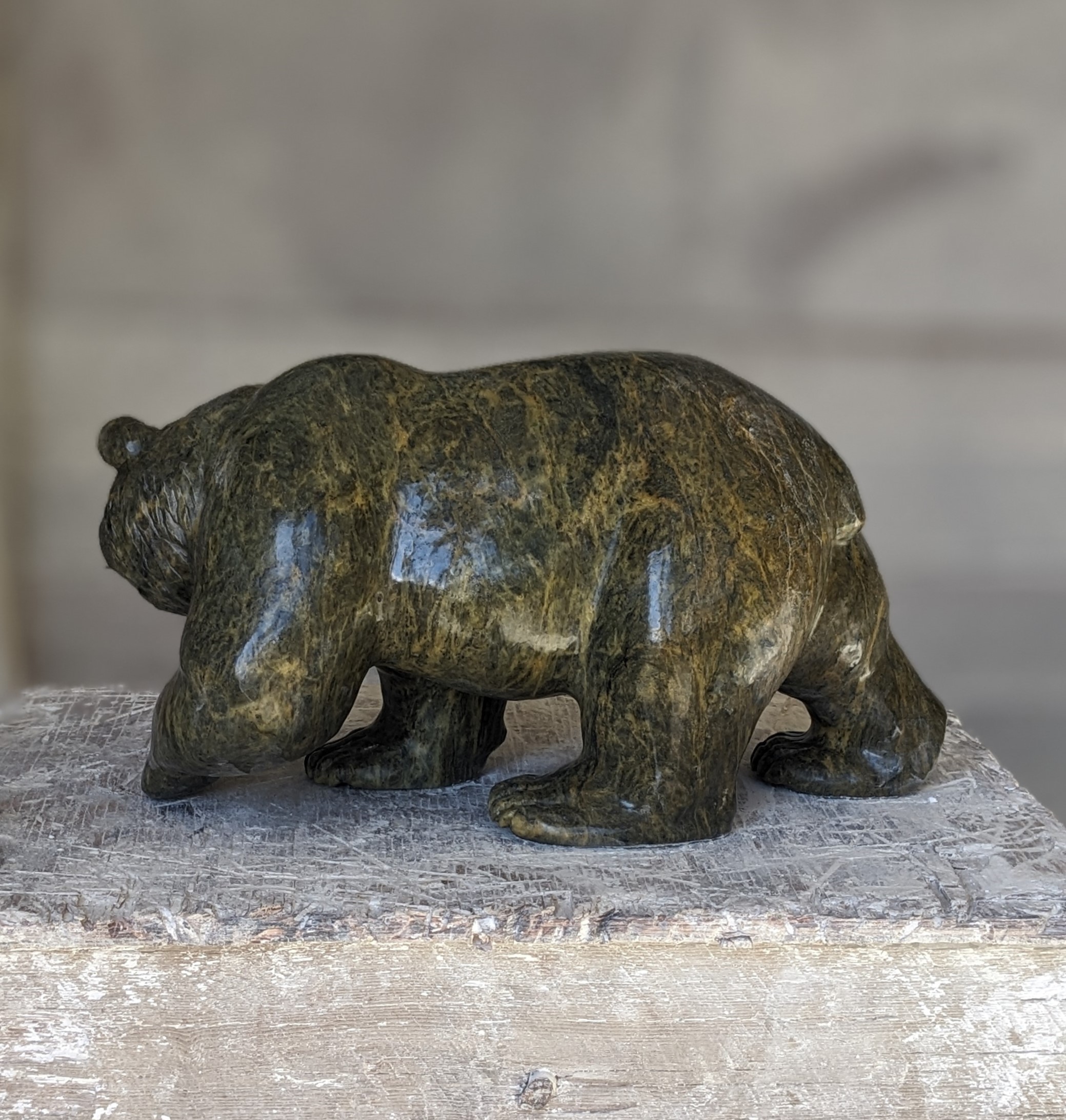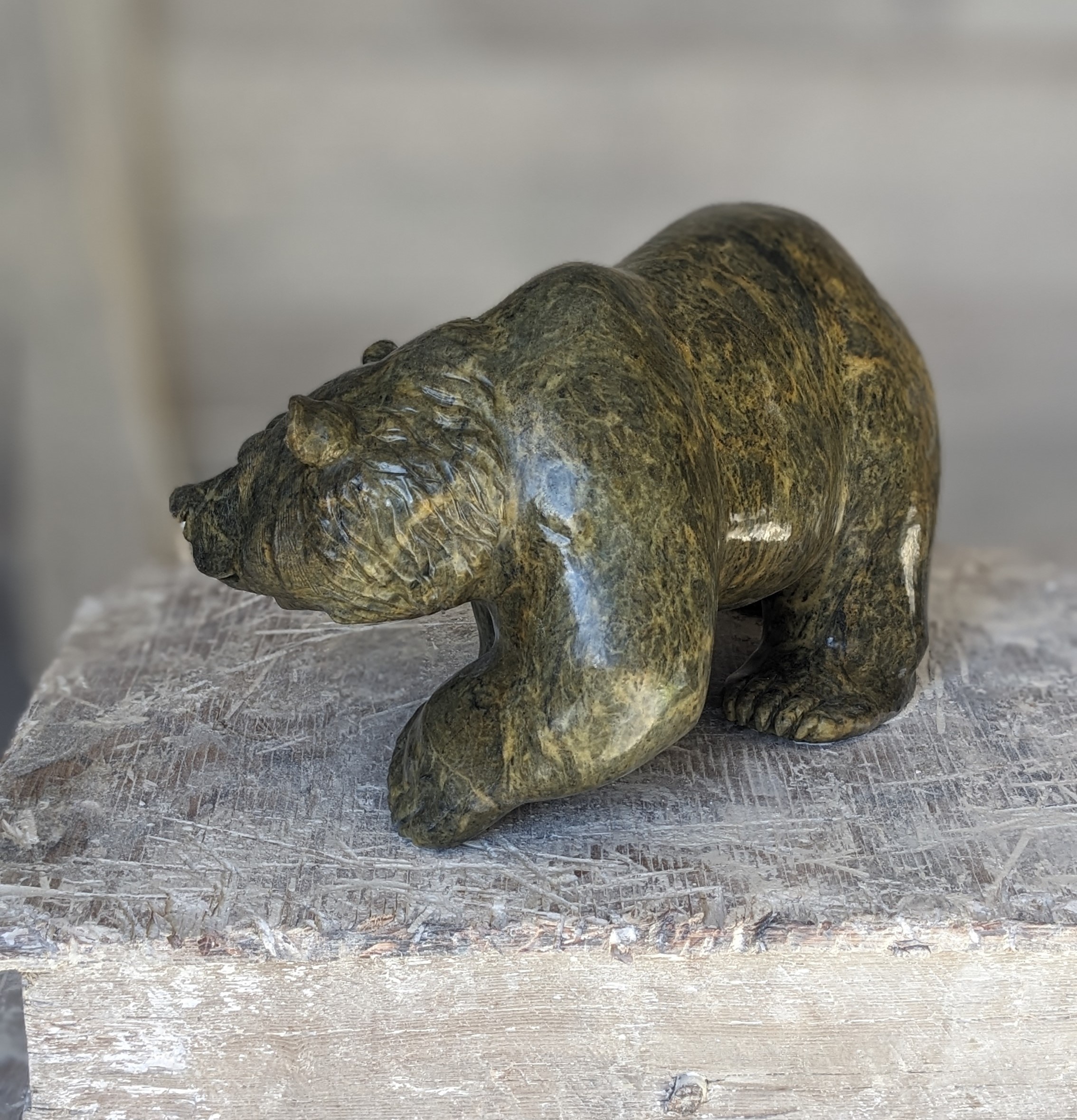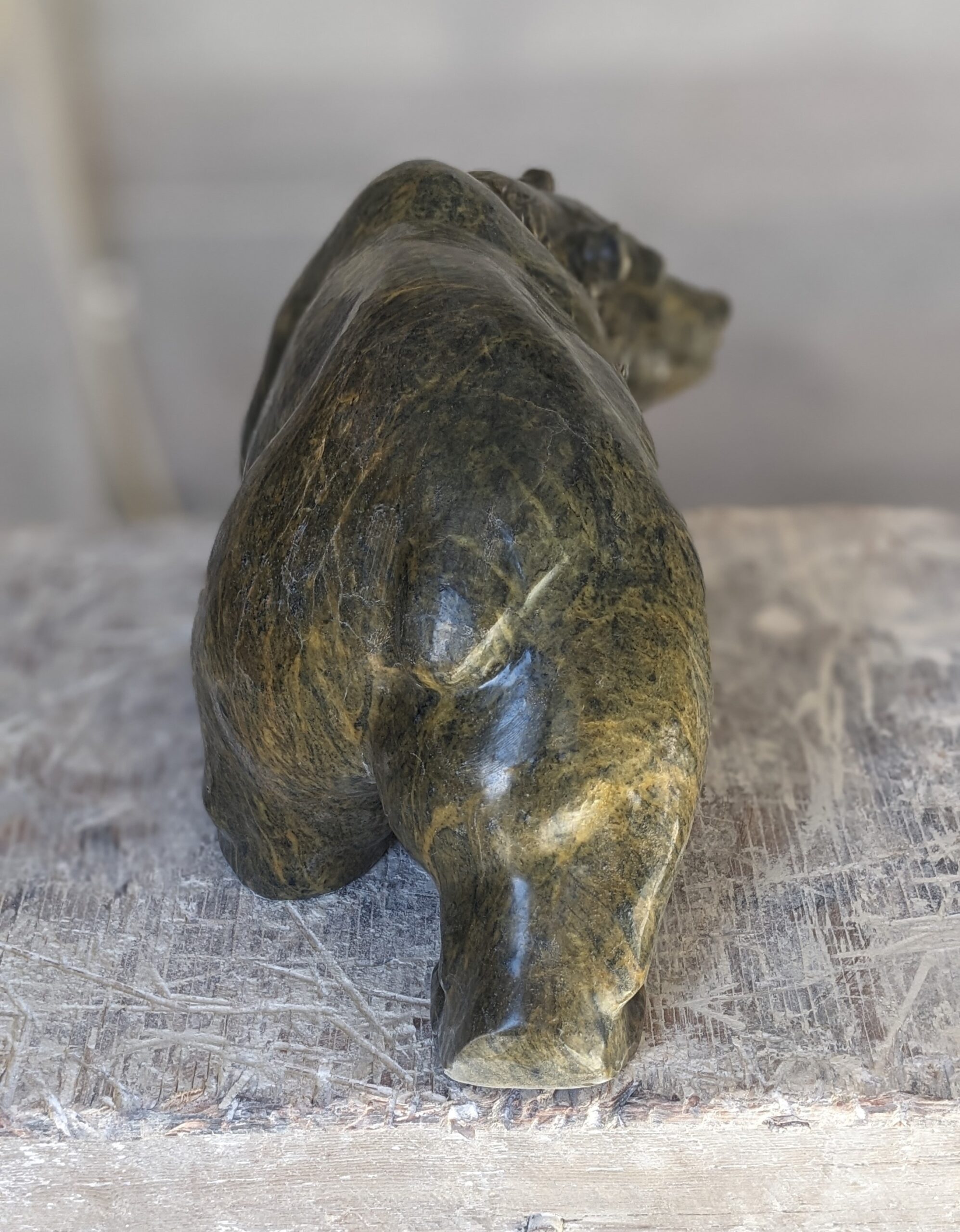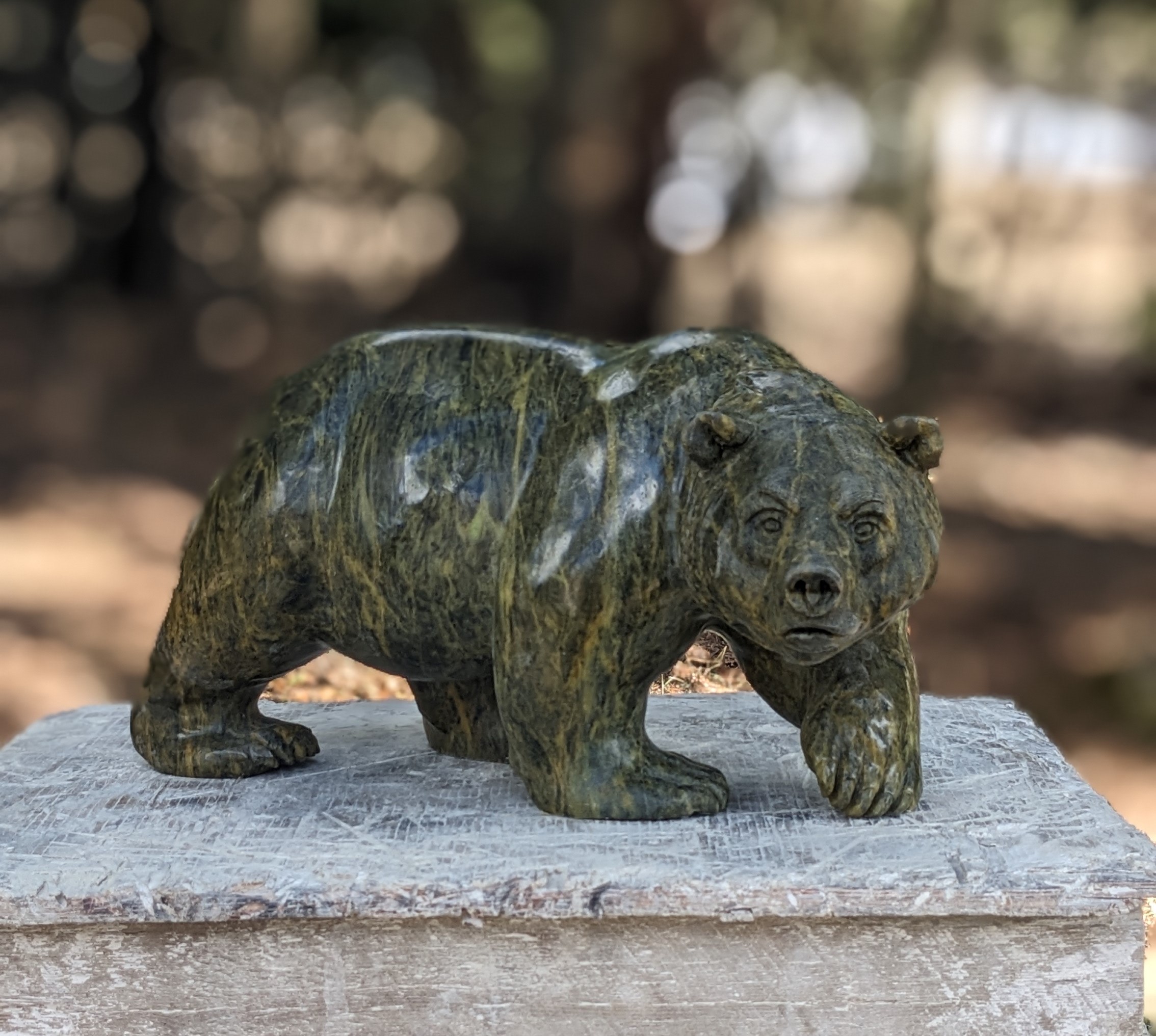 Animal: Grizzly Bear Stone: Indian Soapstone Dimensions: 14(L) x 7.5(H) x 6(W) Inch Weight: 28LB.