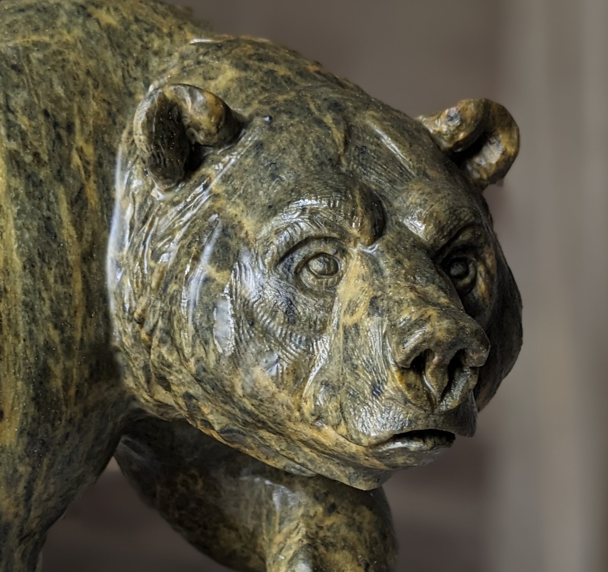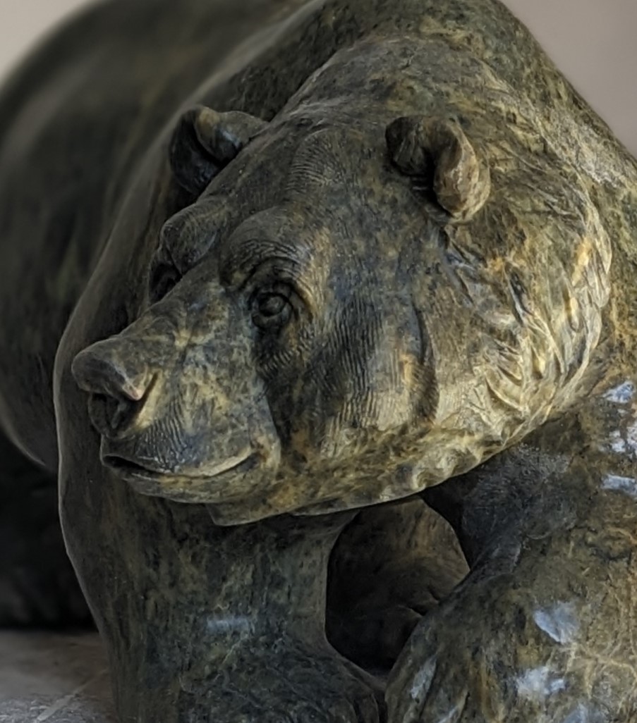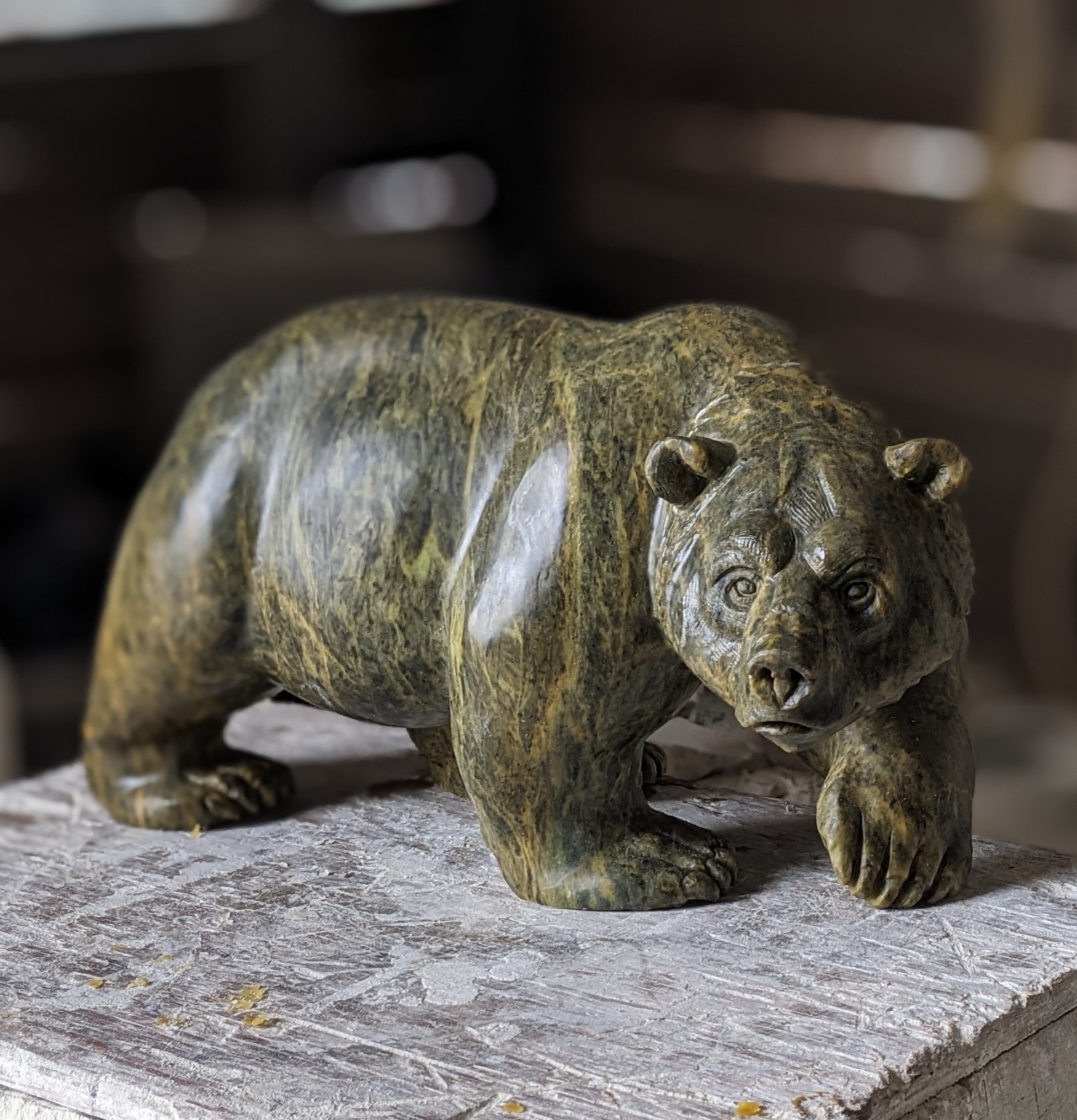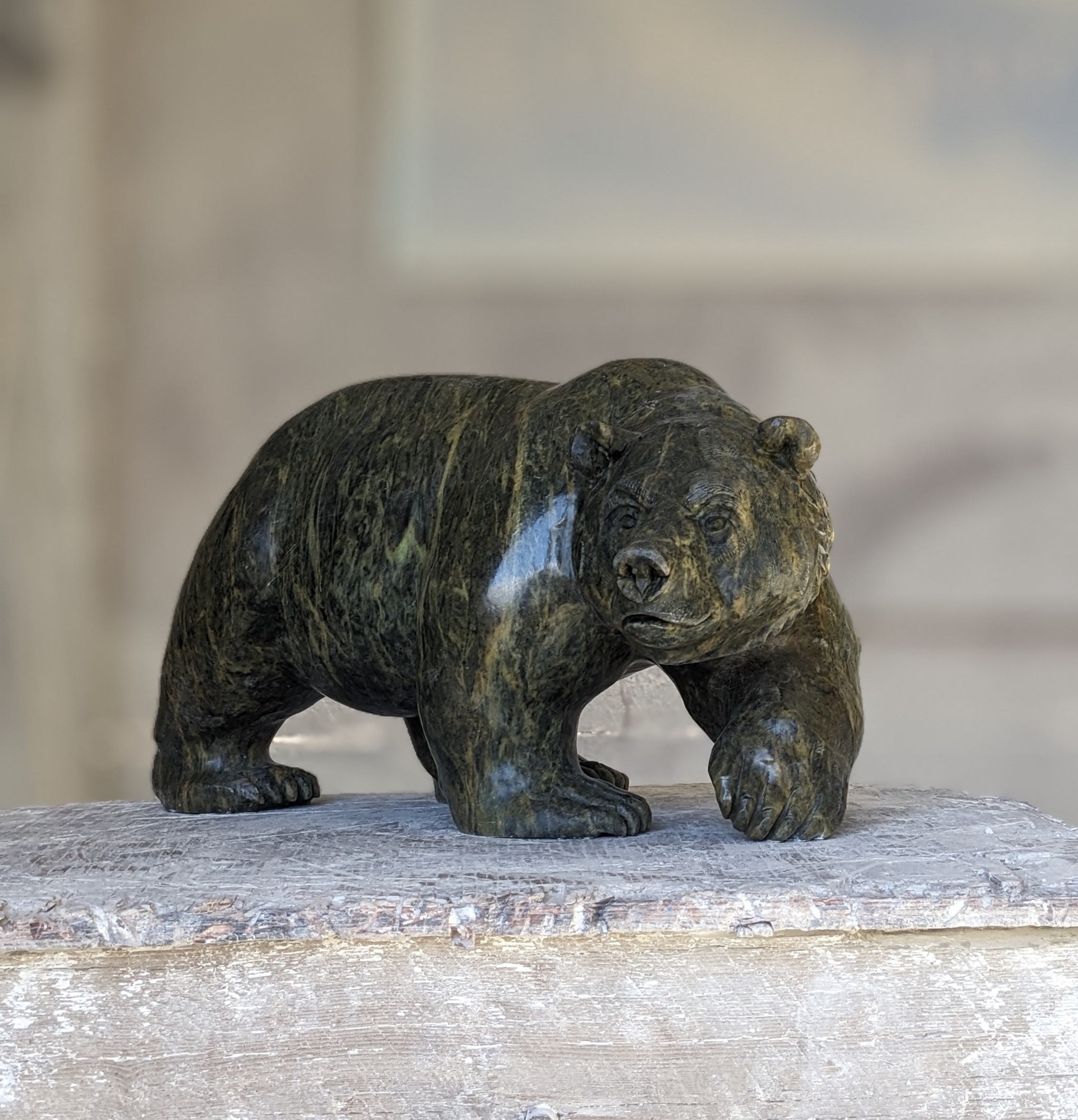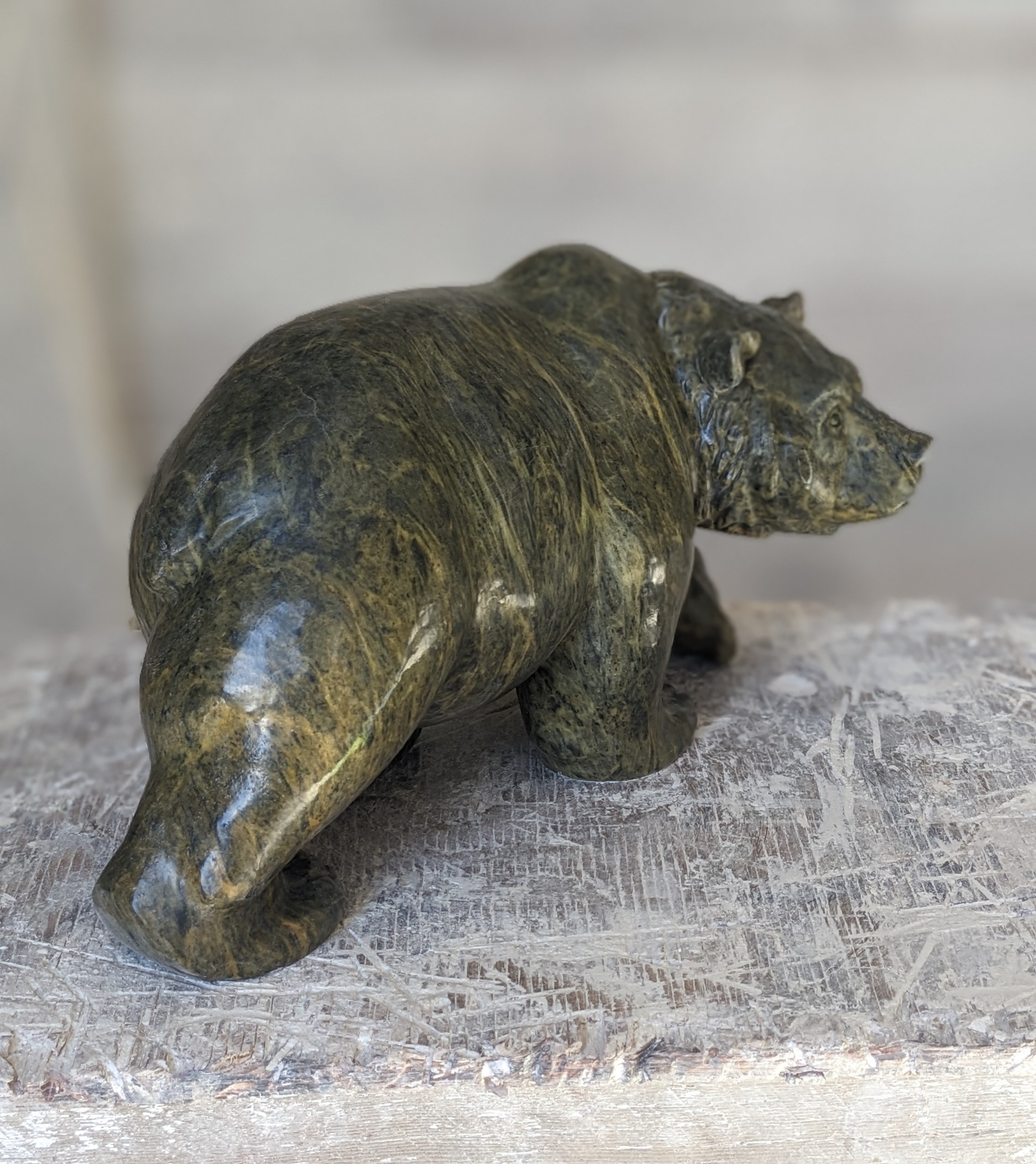 Animal: Grizzly Bear Stone: Indian Soapstone Dimensions: 14(L) x 7.5(H) x 6(W) Inch Weight: 28LB.