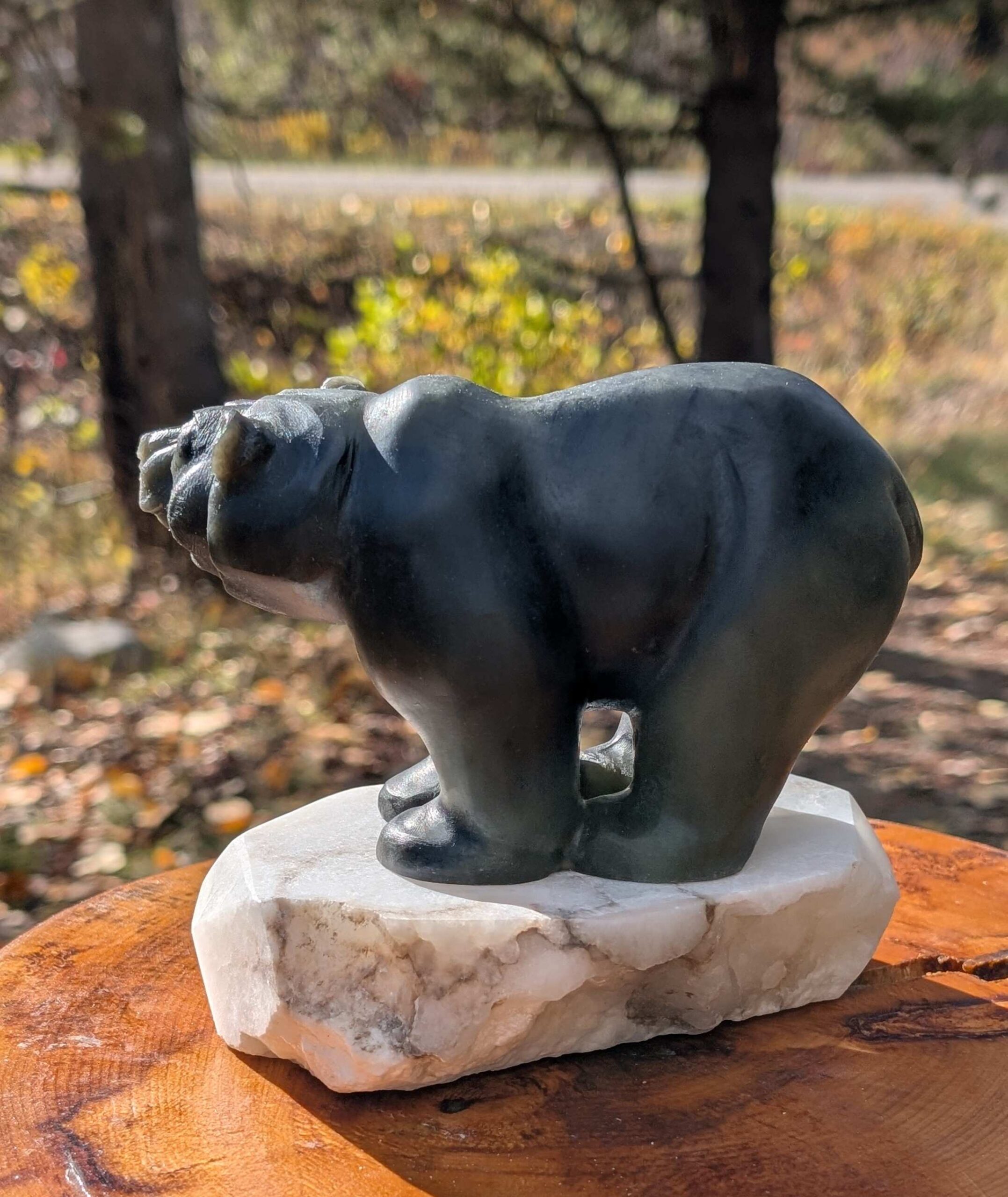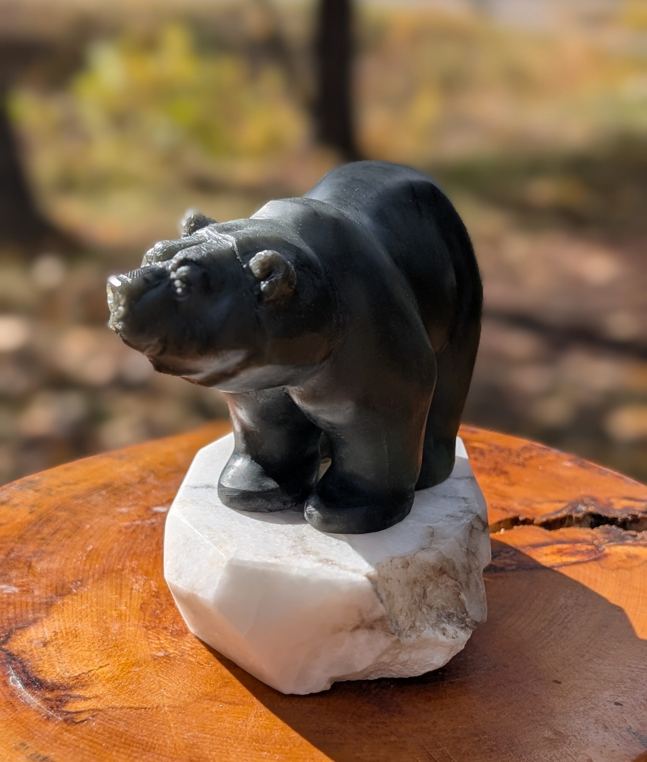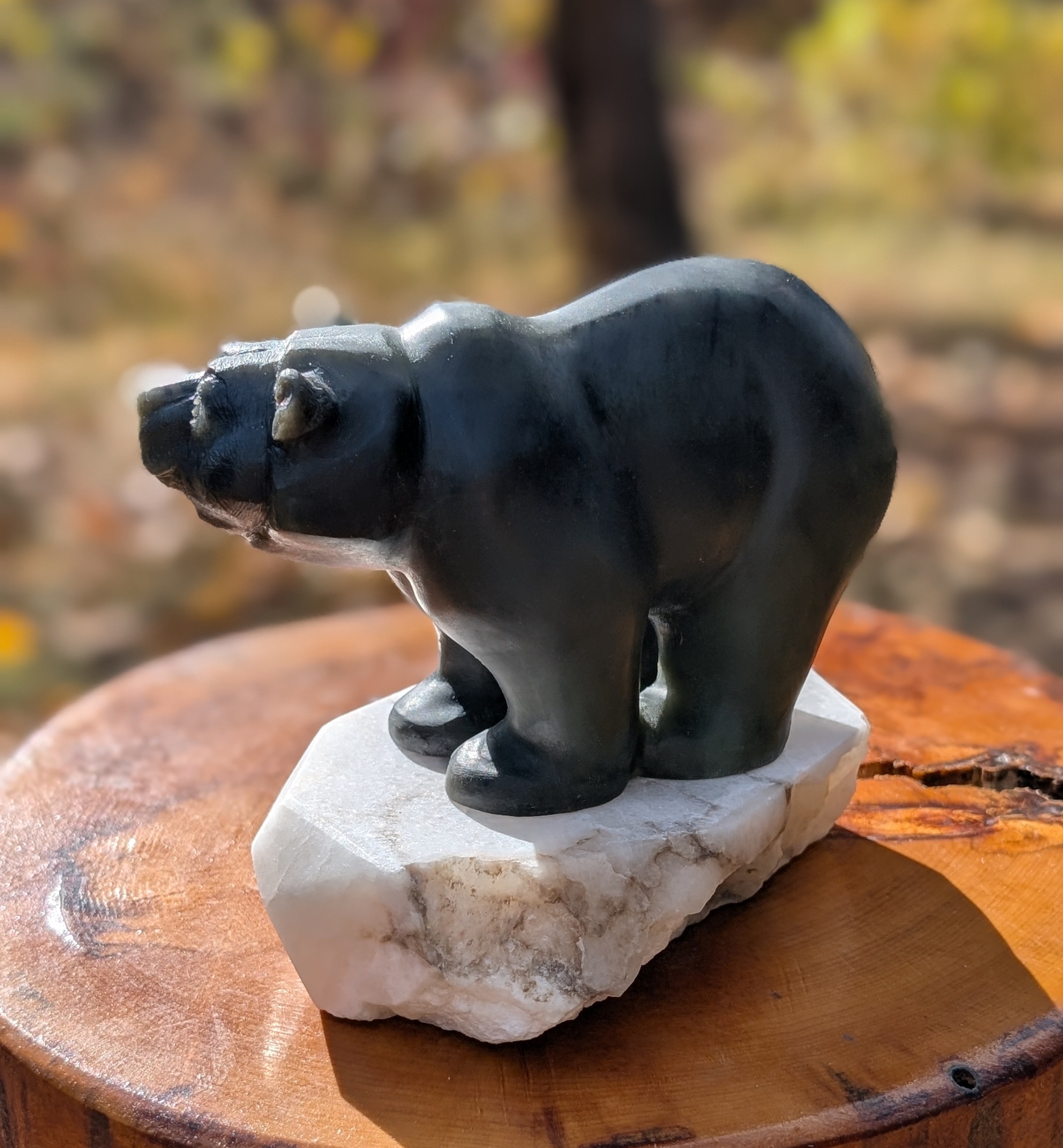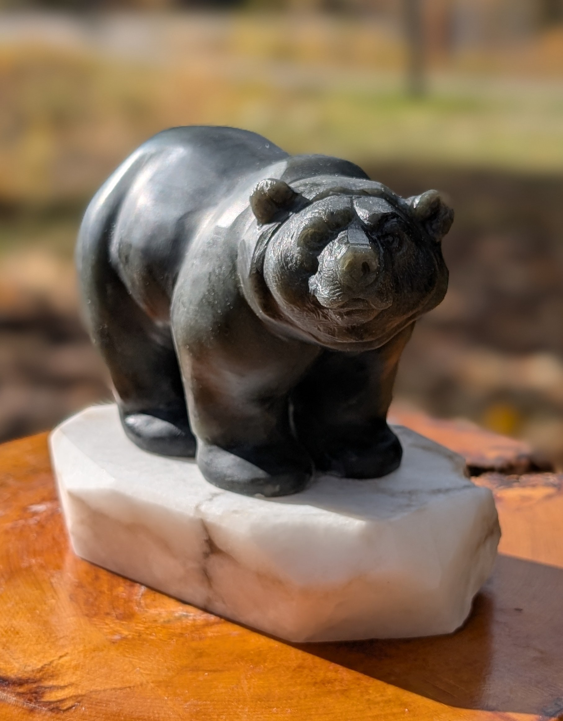 Animal: Grizzly Bear Stone: Brazilian Soapstone (Bear) with Alabaster (Base) Dimensions: 5.5H x 6.5L x 3.5W inch Weight: Approx 5LB