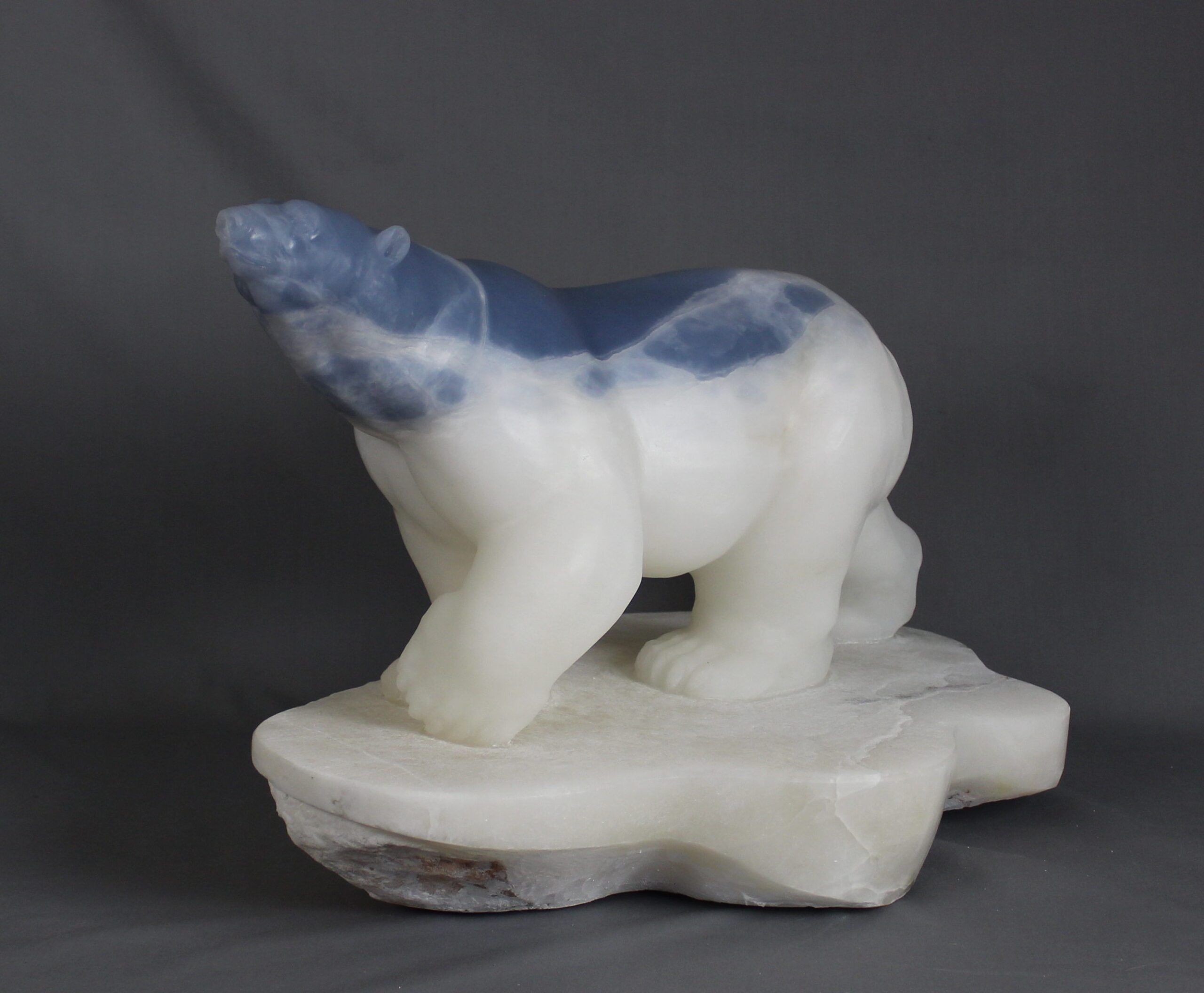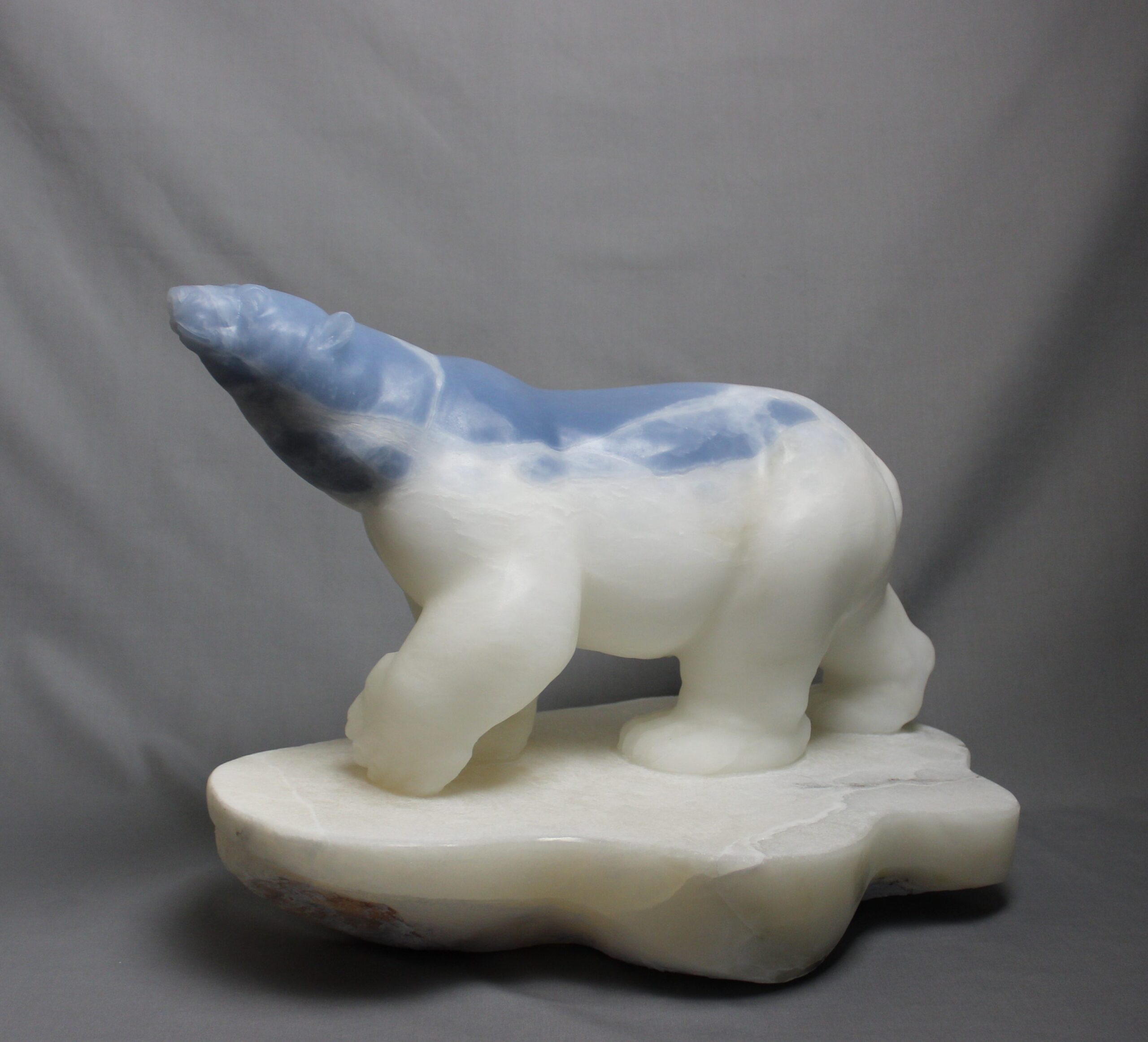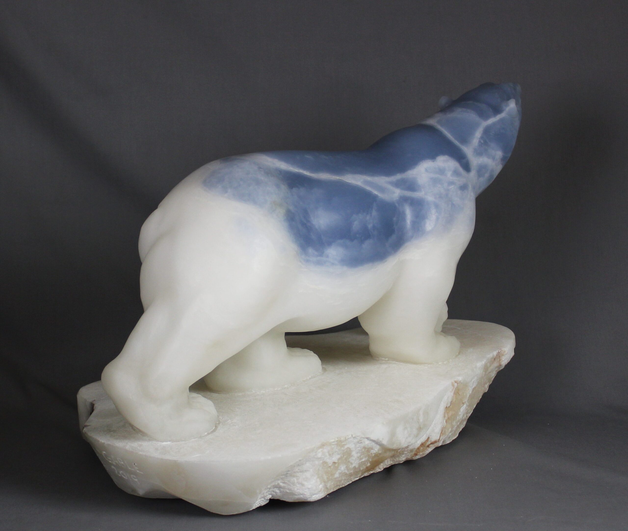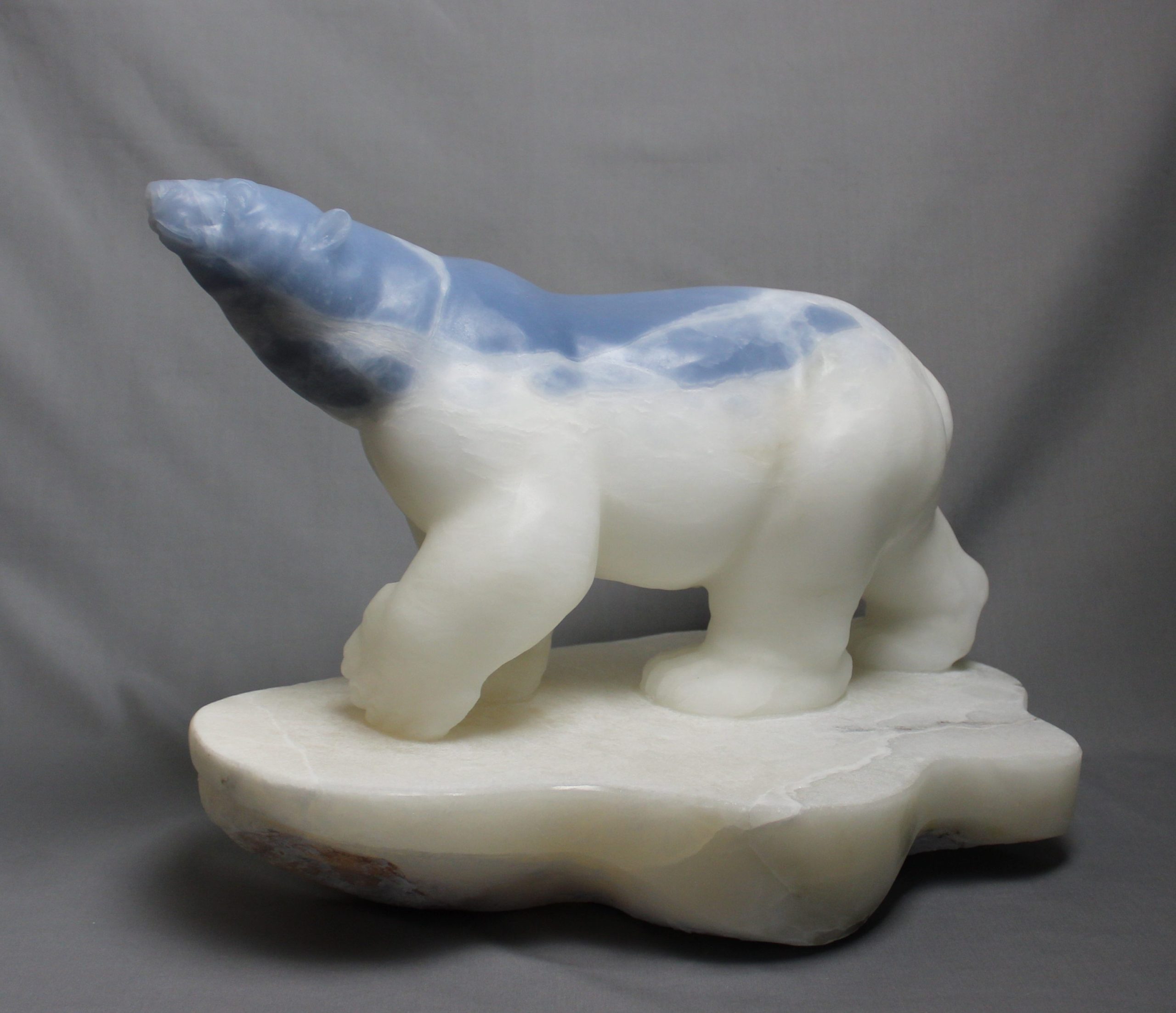Title: “Ocean” Animal: Polar Bear on Ice Berg Stone Type: Spanish Alabaster Weight: 80 Dimensions: 19(L) x 13(W) x 14(H)