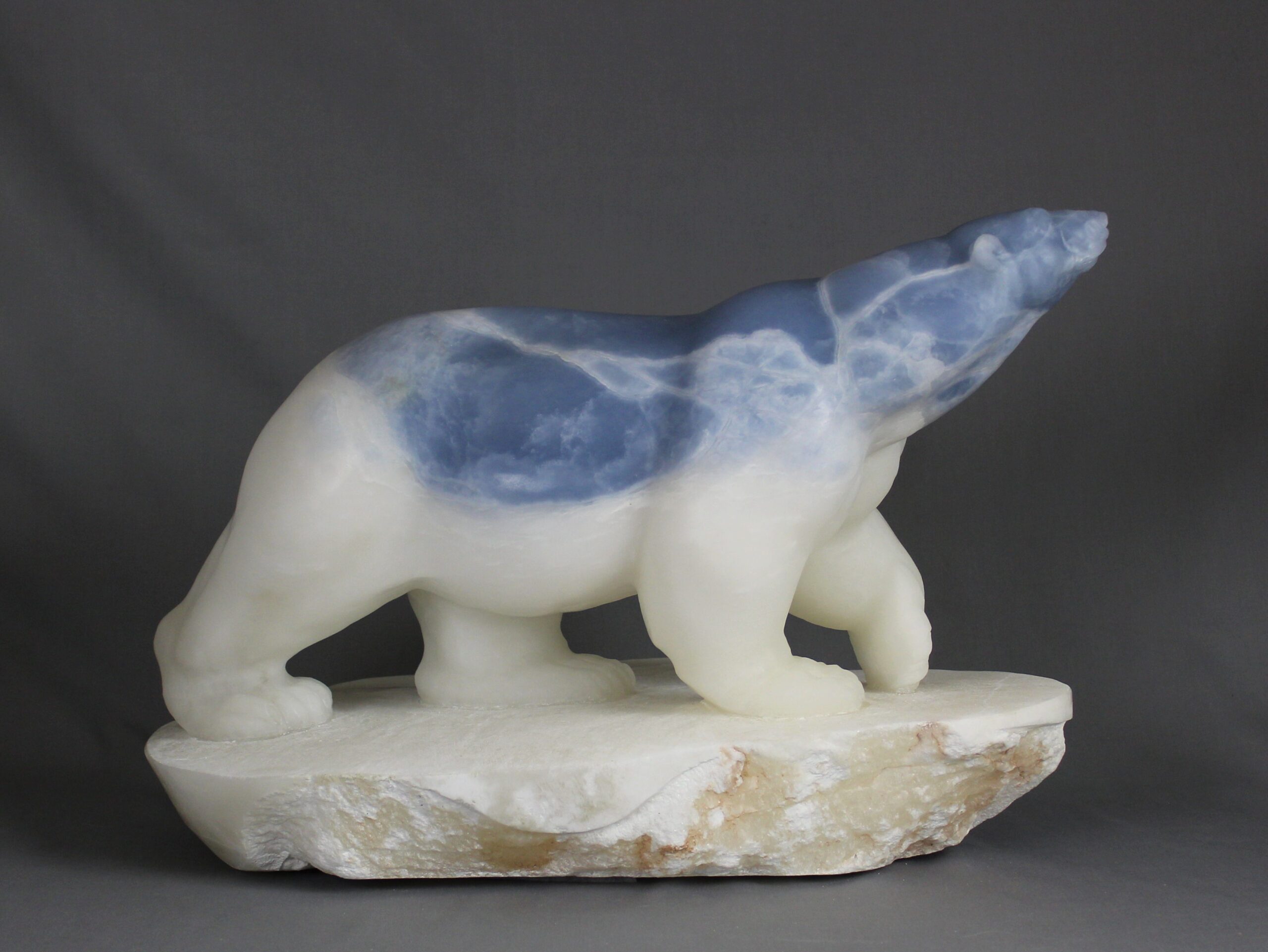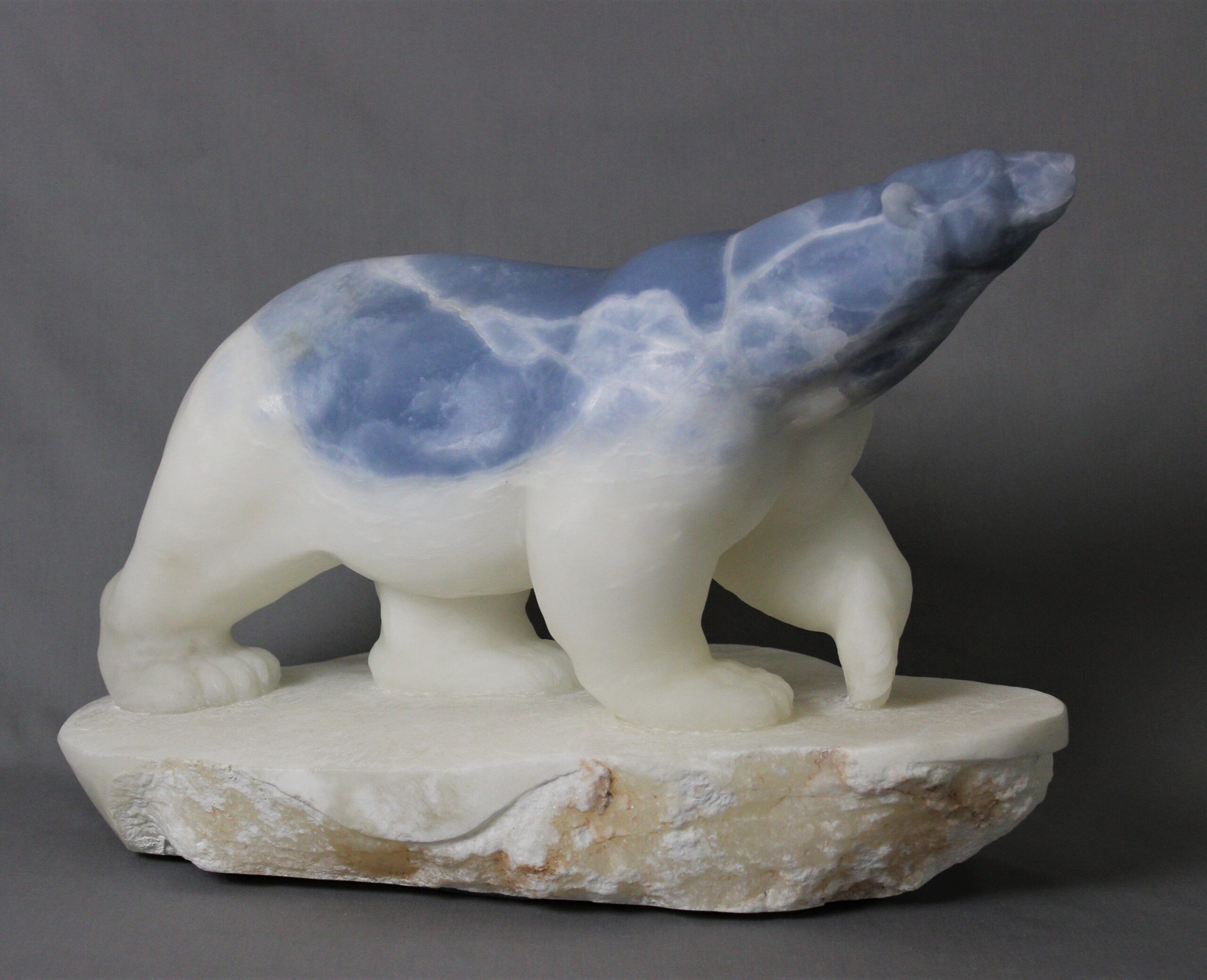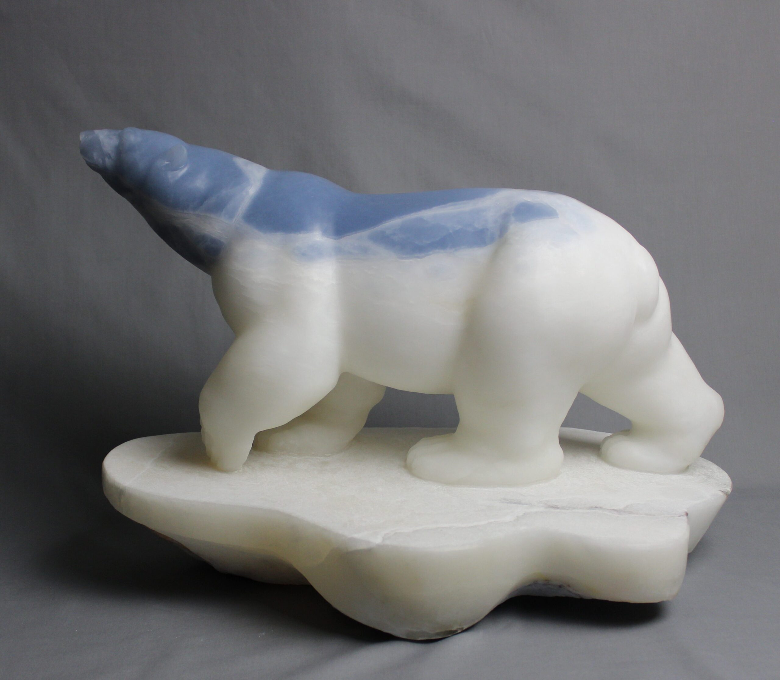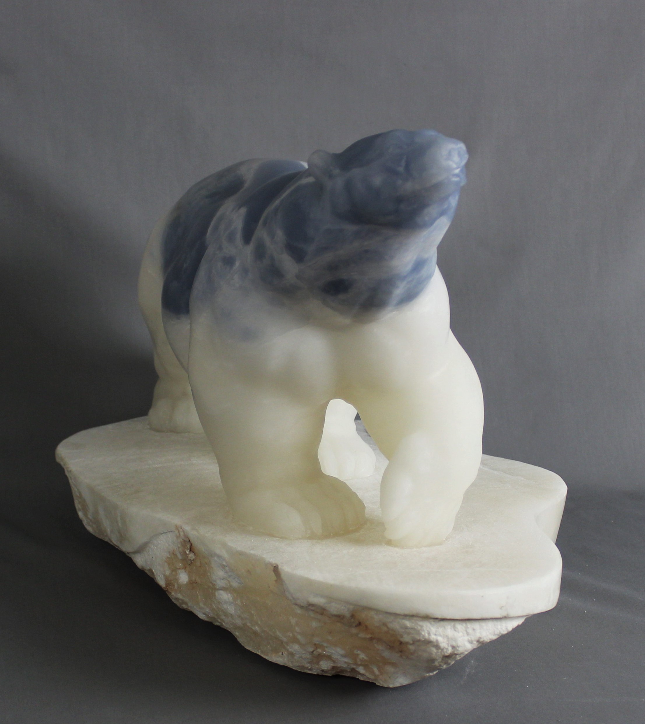 Title: “Ocean” Animal: Polar Bear on Ice Berg Stone Type: Spanish Alabaster Weight: 80 Dimensions: 19(L) x 13(W) x 14(H)