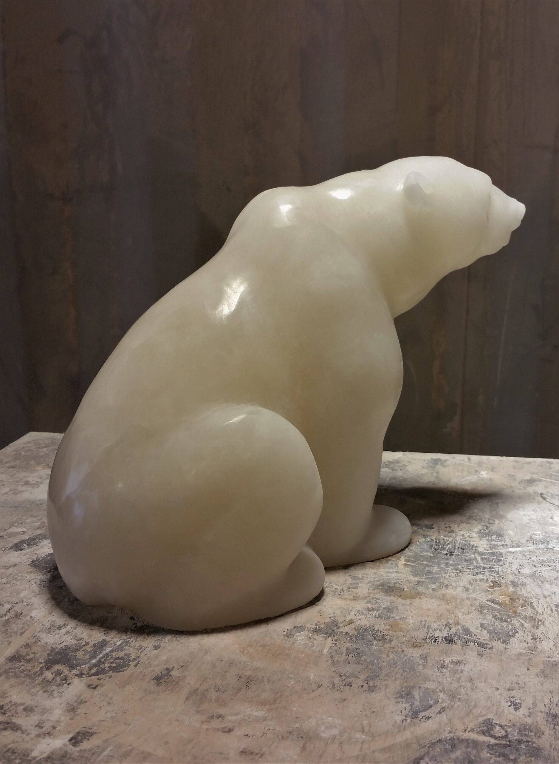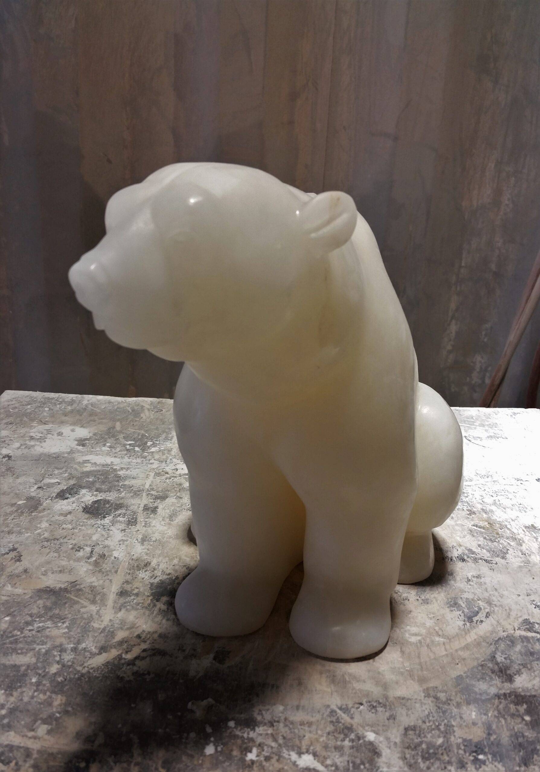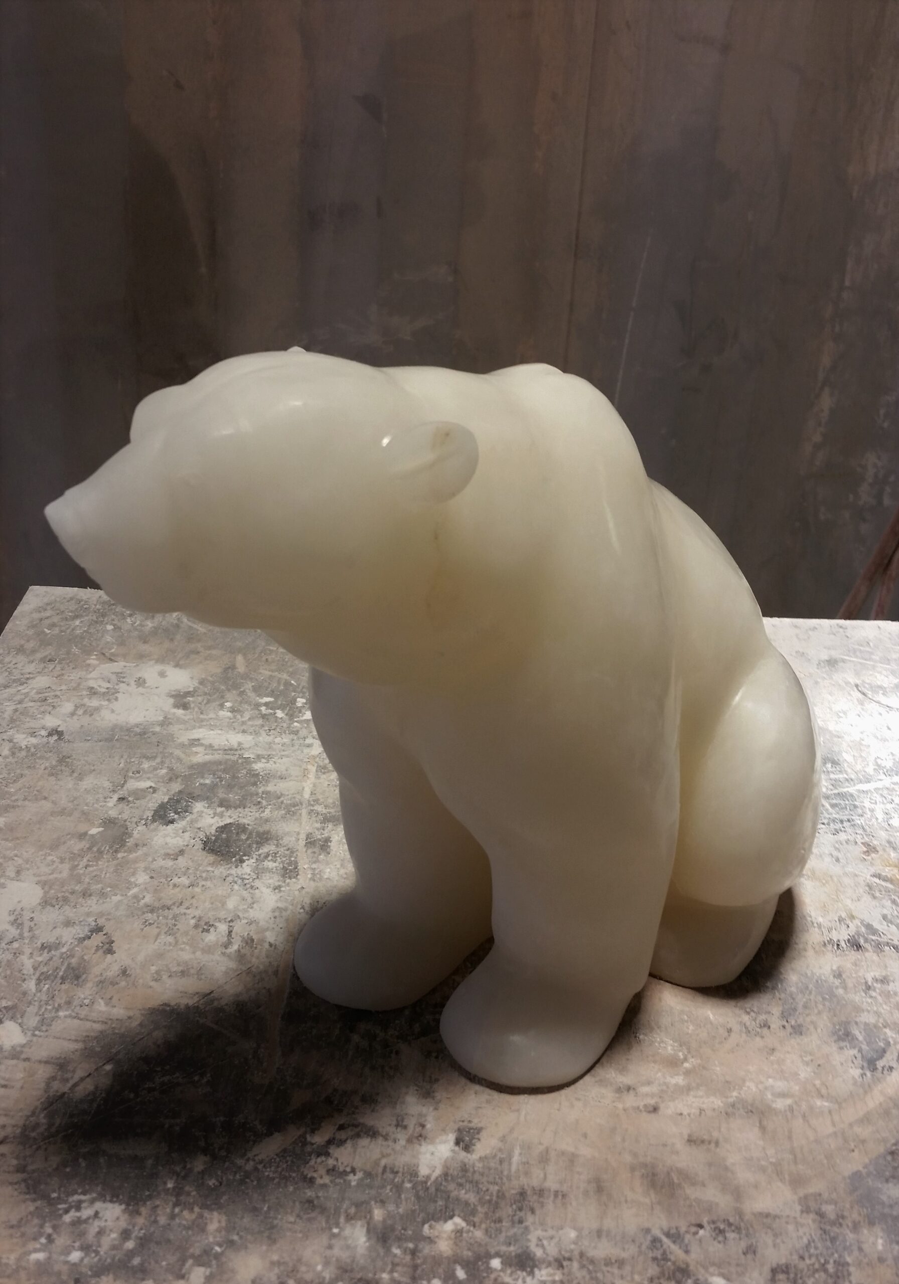 This sculpture is handcarved out of single piece of white translucent alabaster. The title “Pearl” I derived from the soft pearly finish that this white alabaster stone has. Every stone I carve is different and has its own unique characteristics that eventually contributes to the overall look and feel of the final piece. This particular piece of alabaster was a very sensitive stone which requires more of a gentleness while carving and polishing so as to really bring through the stones natural coloration without bruising, cracking, or breaking the stone. I find the alabaster stone compliments the simple whitish color and elegant form of the beautiful Polar Bear.