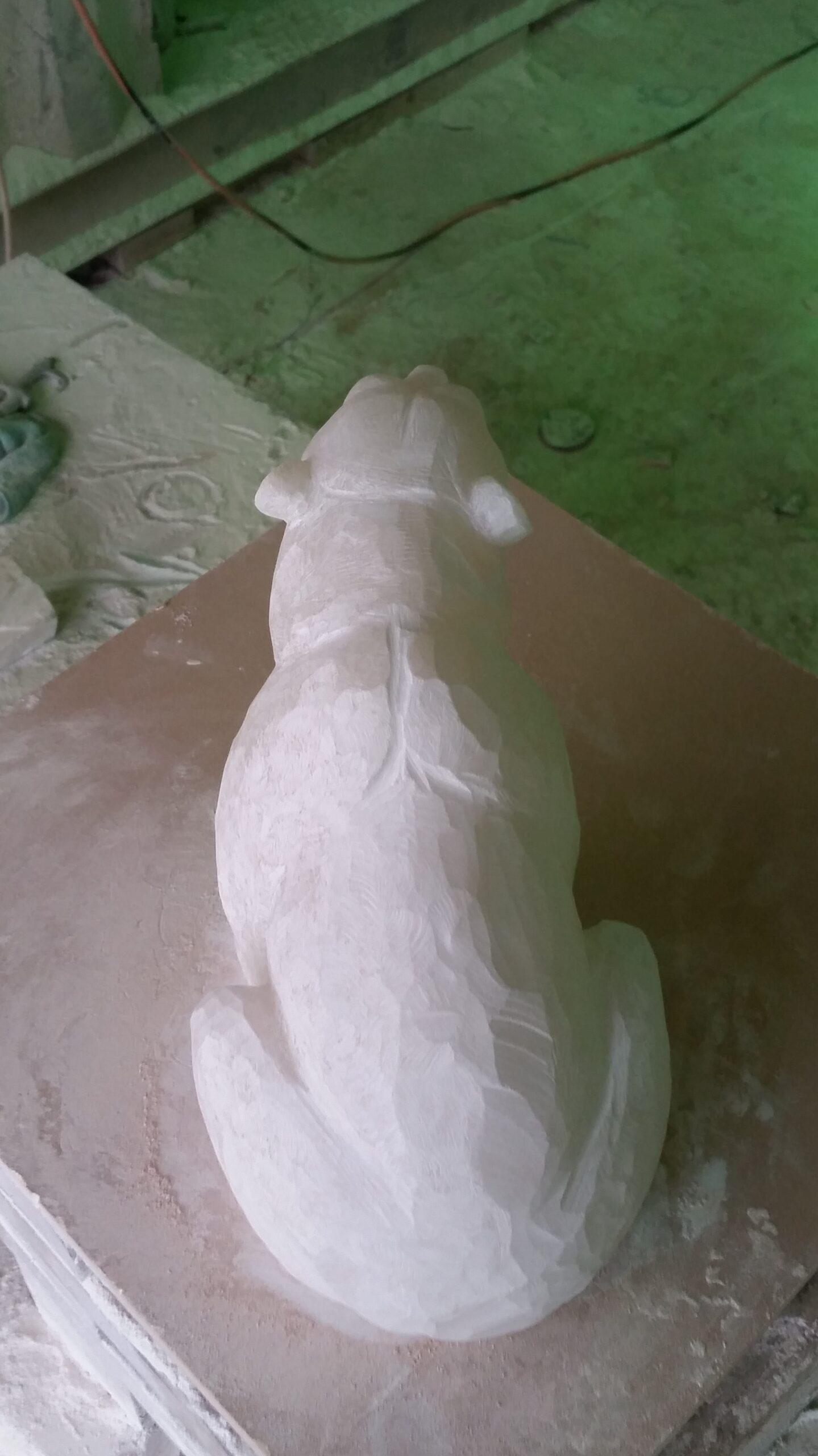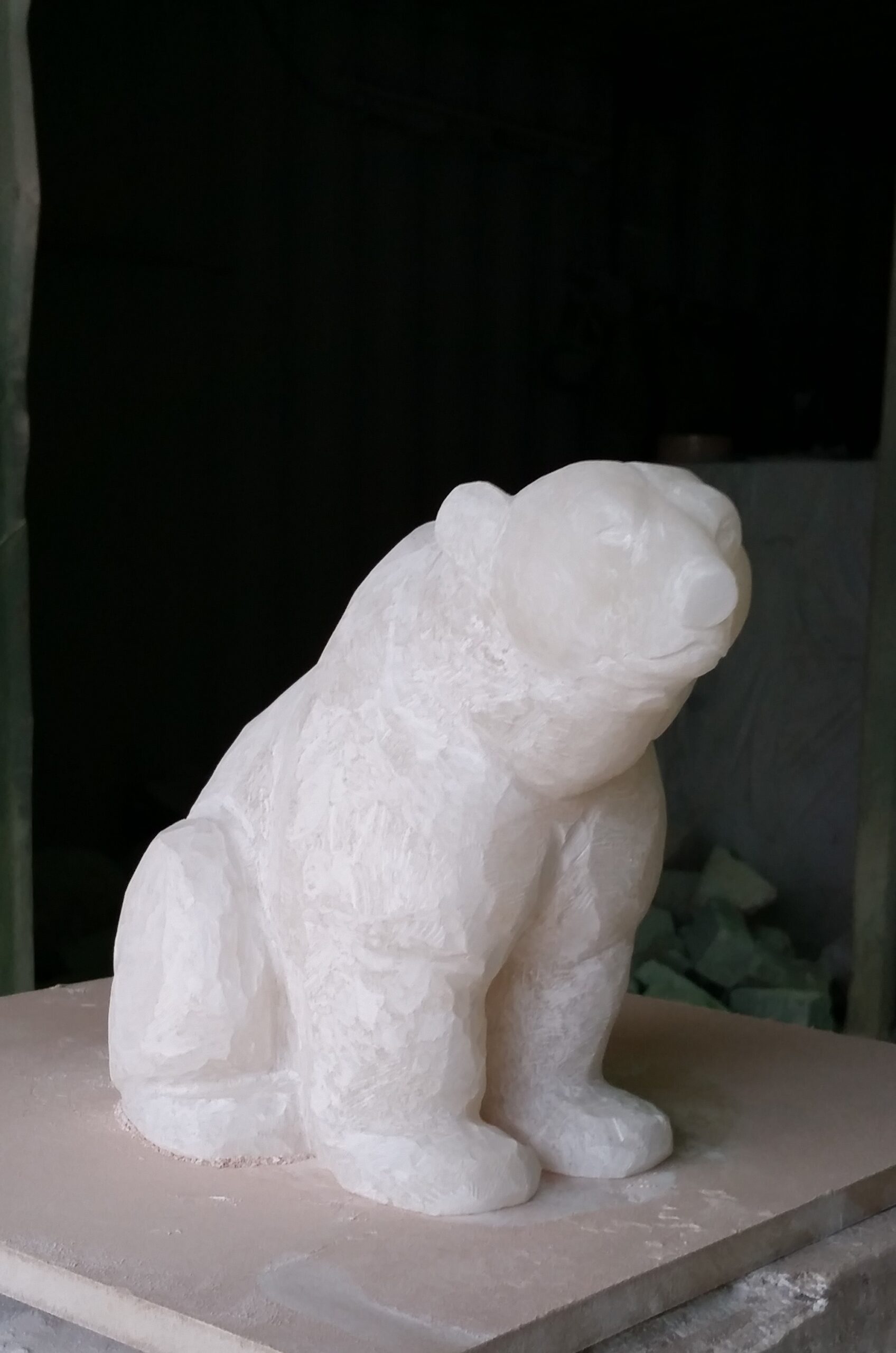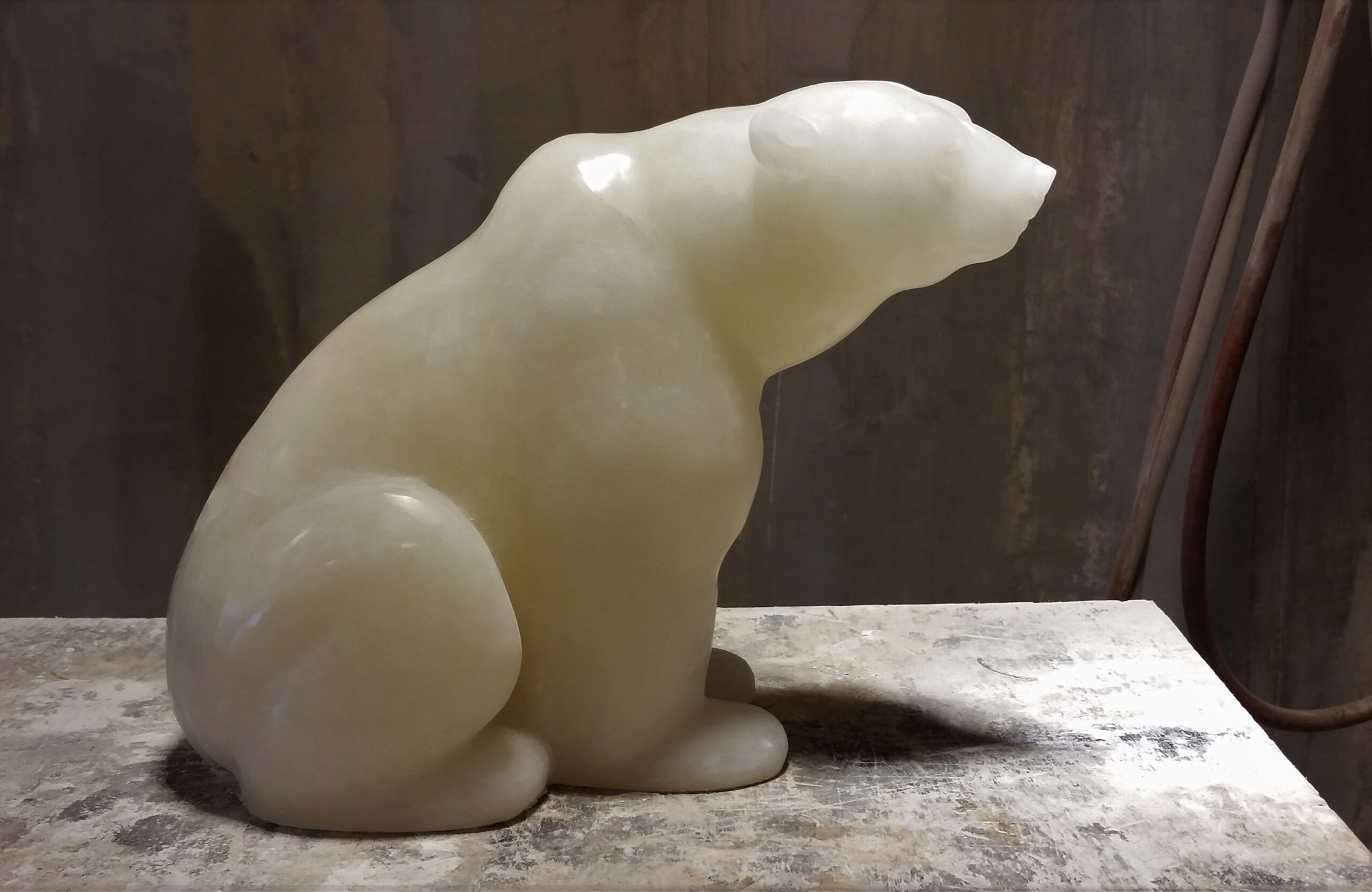 This sculpture is handcarved out of single piece of white translucent alabaster. The title “Pearl” I derived from the soft pearly finish that this white alabaster stone has. Every stone I carve is different and has its own unique characteristics that eventually contributes to the overall look and feel of the final piece. This particular piece of alabaster was a very sensitive stone which requires more of a gentleness while carving and polishing so as to really bring through the stones natural coloration without bruising, cracking, or breaking the stone. I find the alabaster stone compliments the simple whitish color and elegant form of the beautiful Polar Bear.