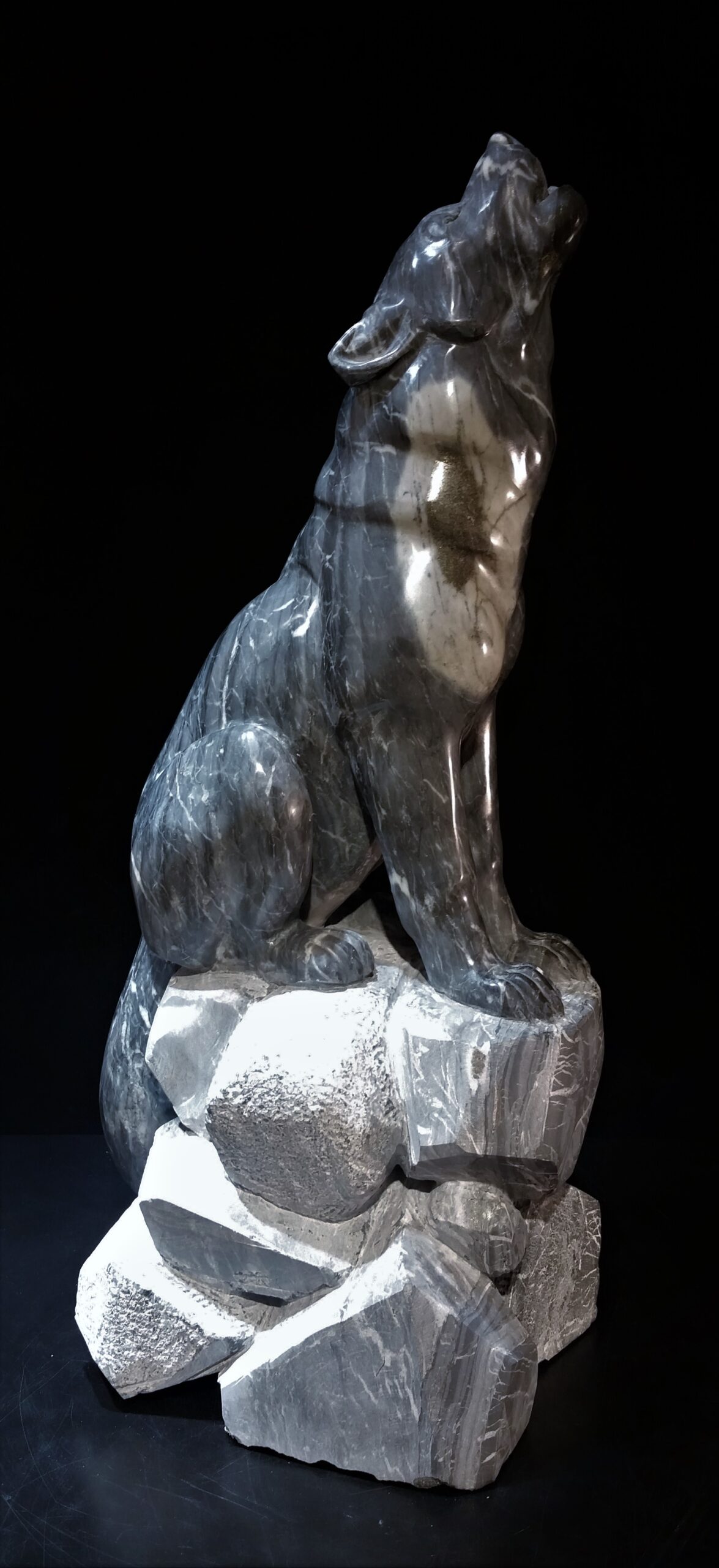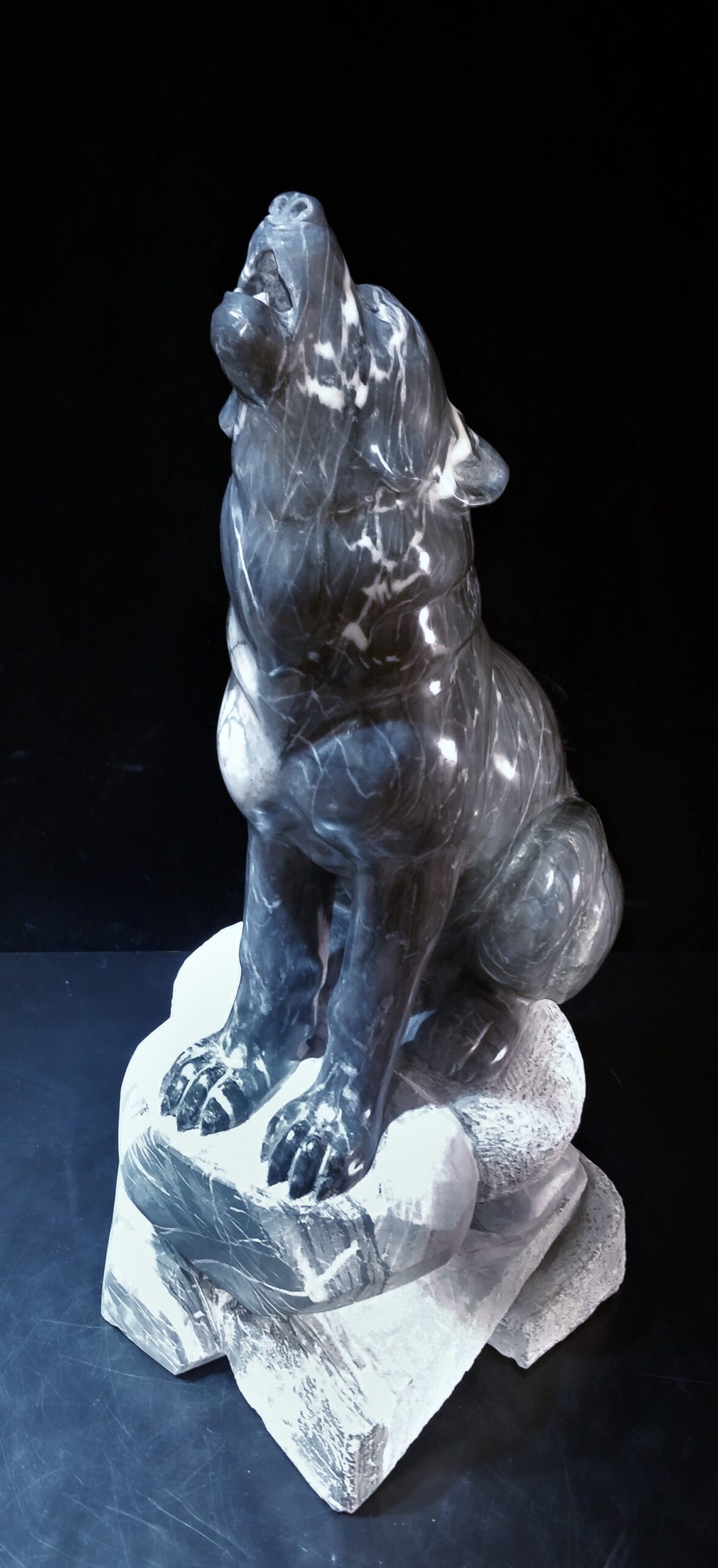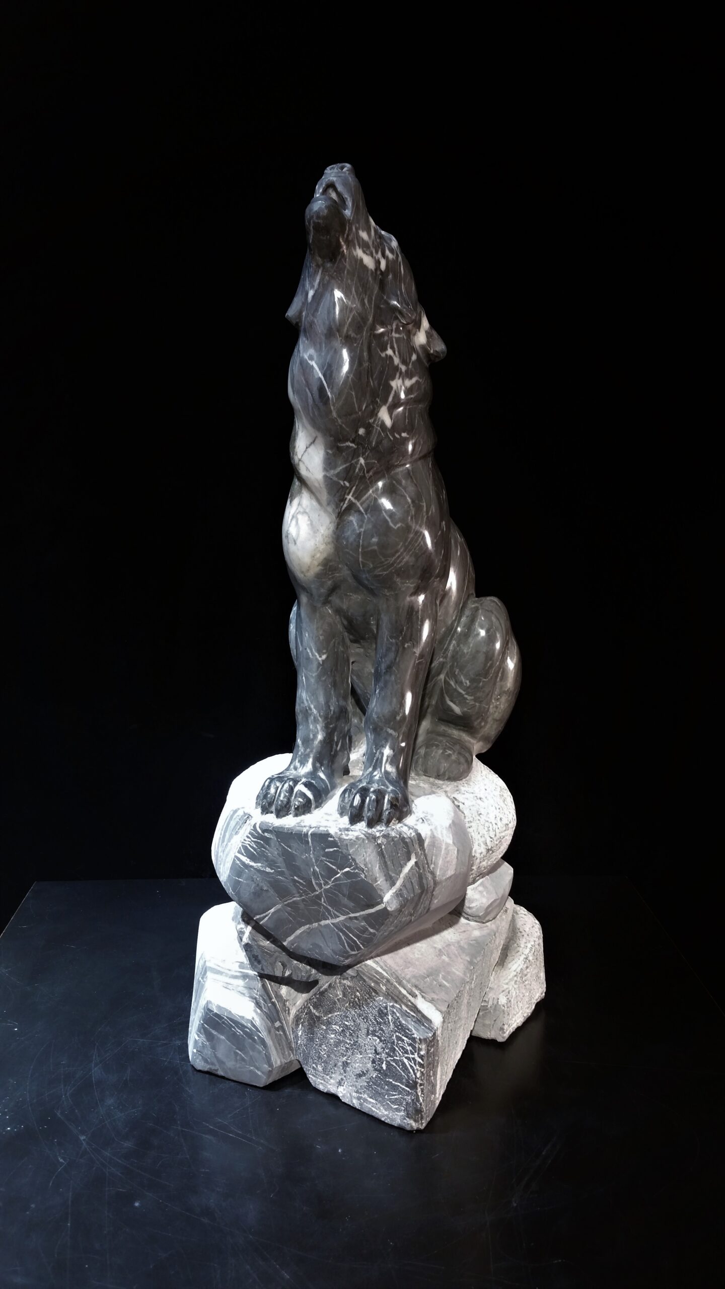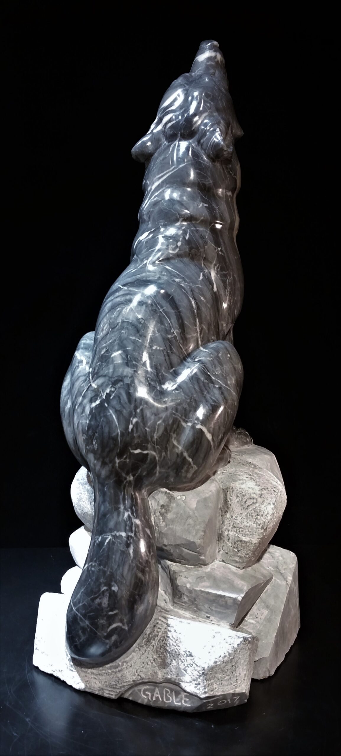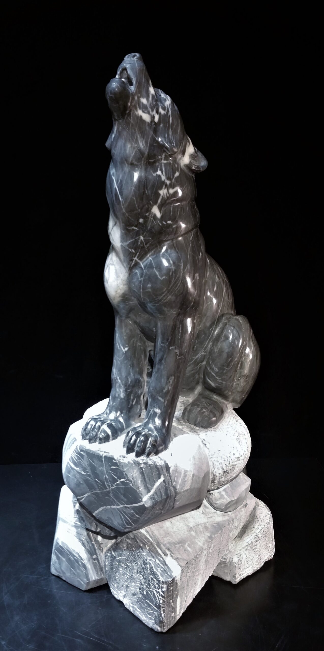 “Soul” is an Original Sculpture of a howling wolf carved out of a single block of Canadian Gray and Black Marble. This piece is one stone. The difference in color between the base and the wolf is achieved by leaving the base with a raw finish where the wolf itself was brought through 5 stages to standing/polishing to achieve the smooth finish revealing the natural black and gray color of the stone.