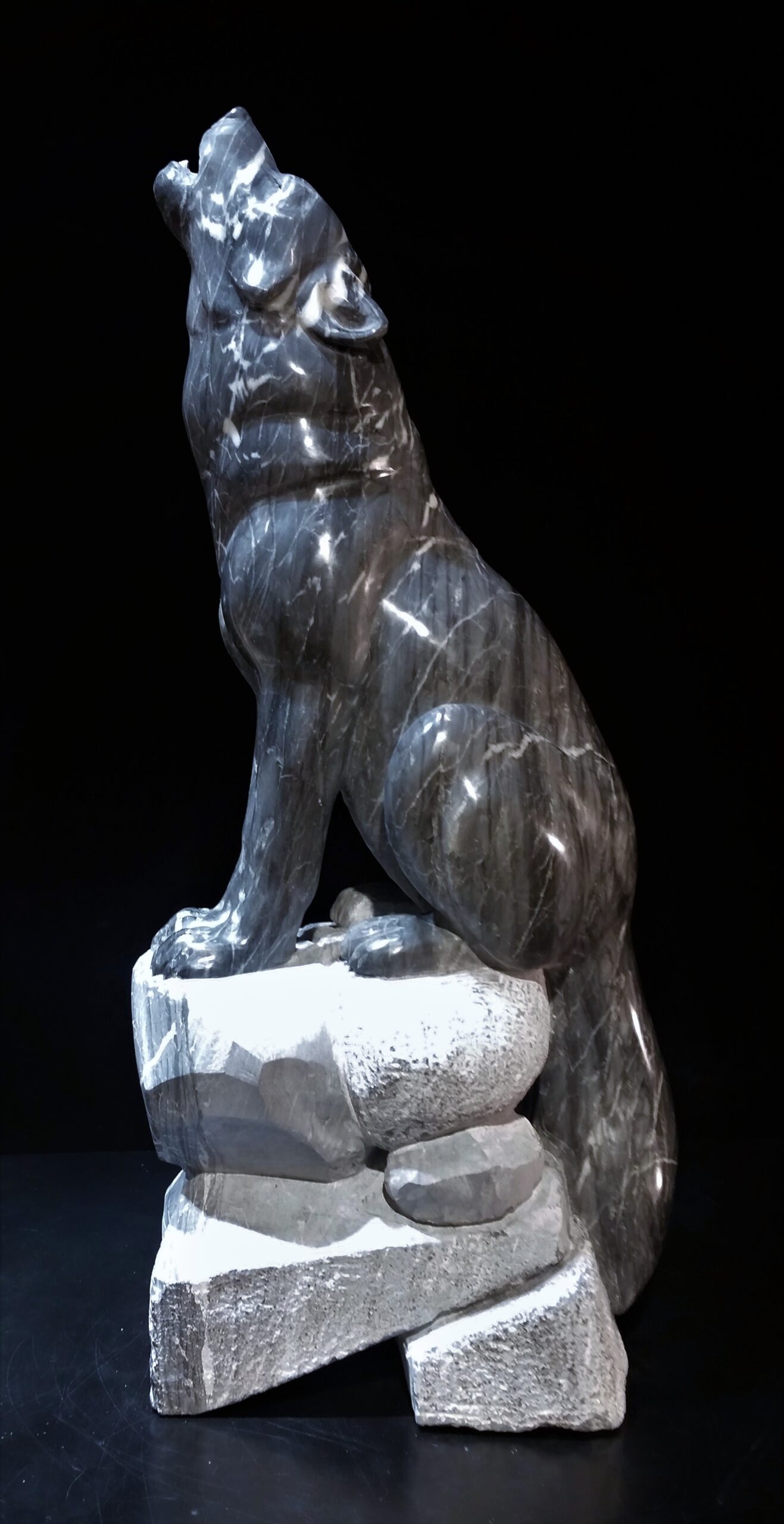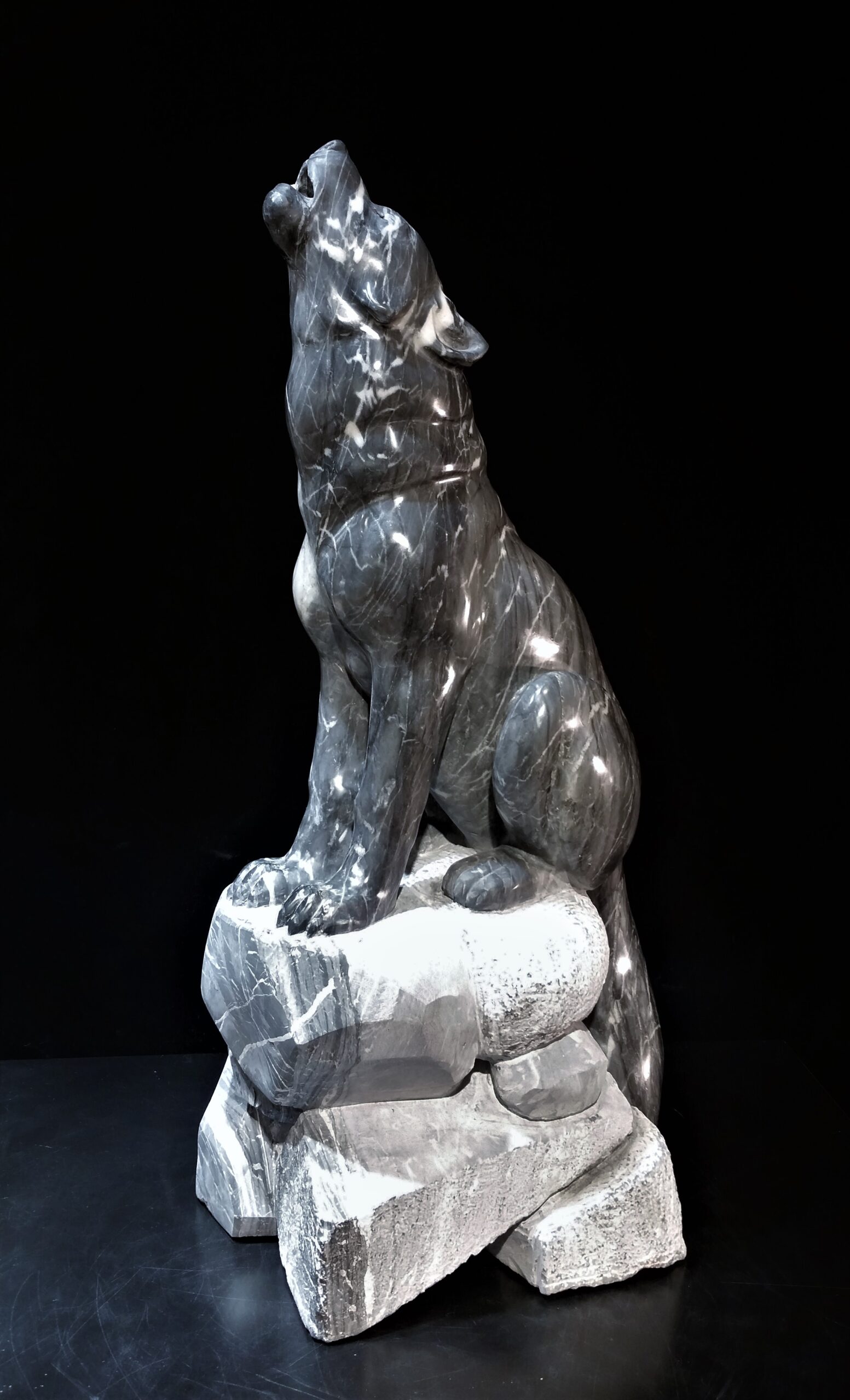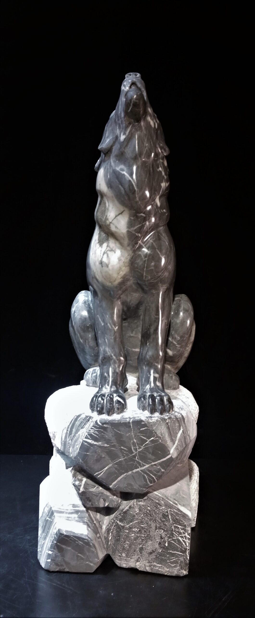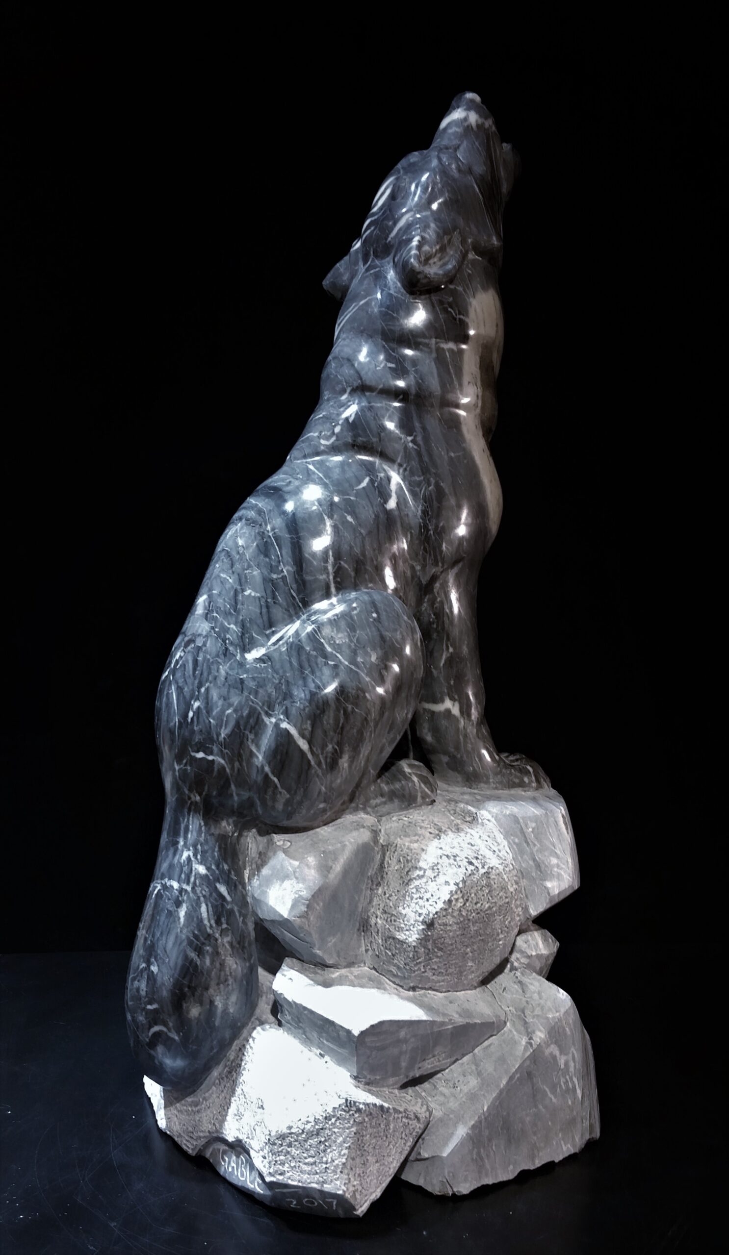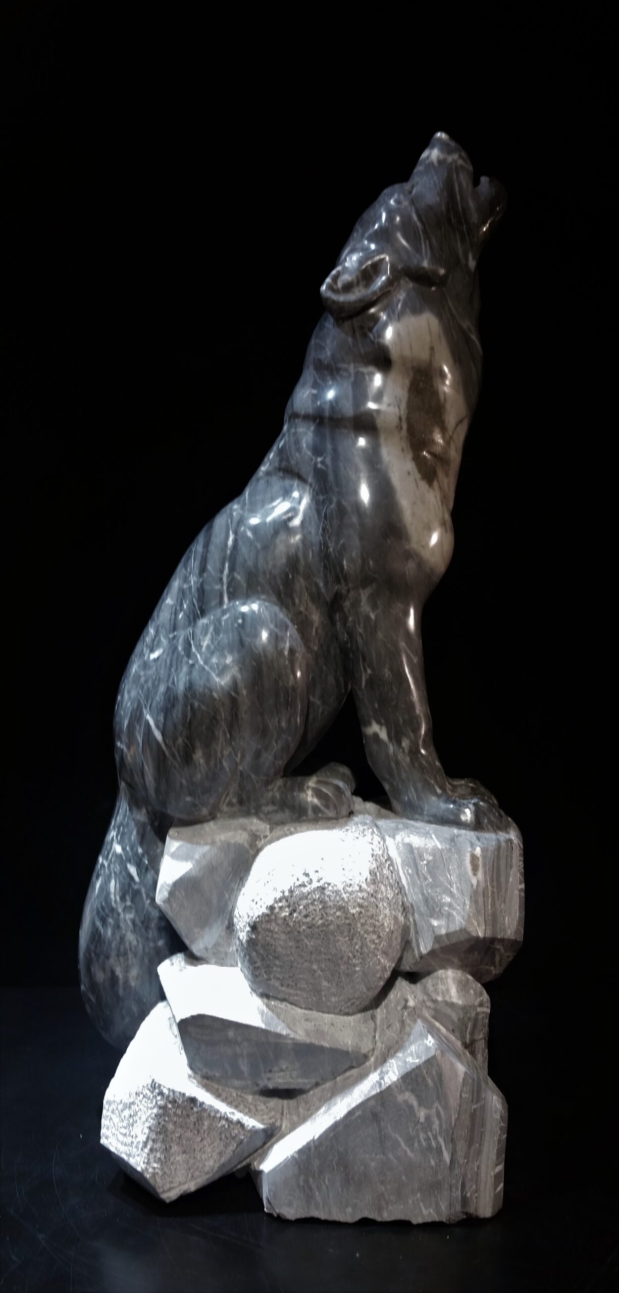 “Soul” is an Original Sculpture of a howling wolf carved out of a single block of Canadian Gray and Black Marble. This piece is one stone. The difference in color between the base and the wolf is achieved by leaving the base with a raw finish where the wolf itself was brought through 5 stages to standing/polishing to achieve the smooth finish revealing the natural black and gray color of the stone.