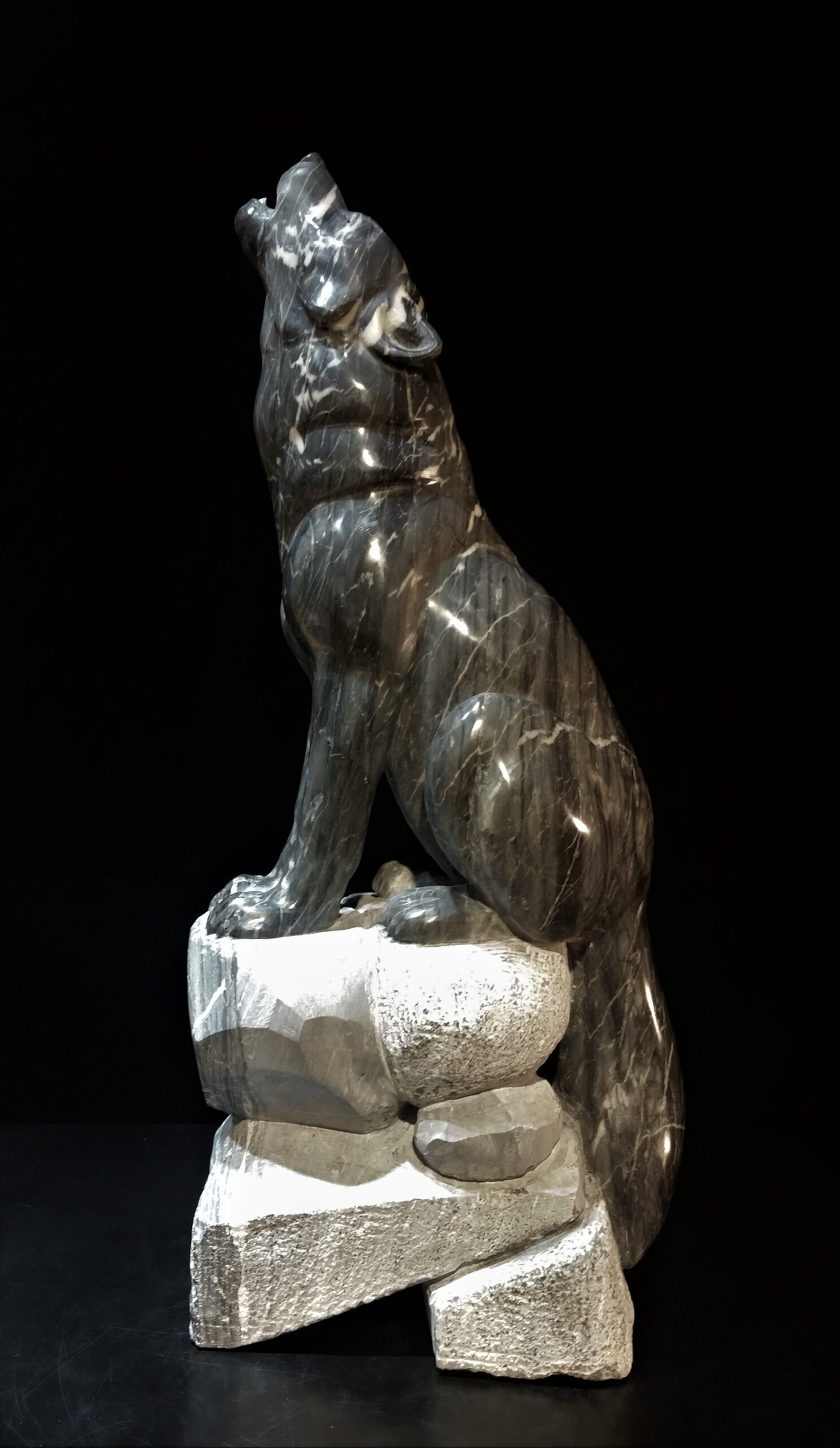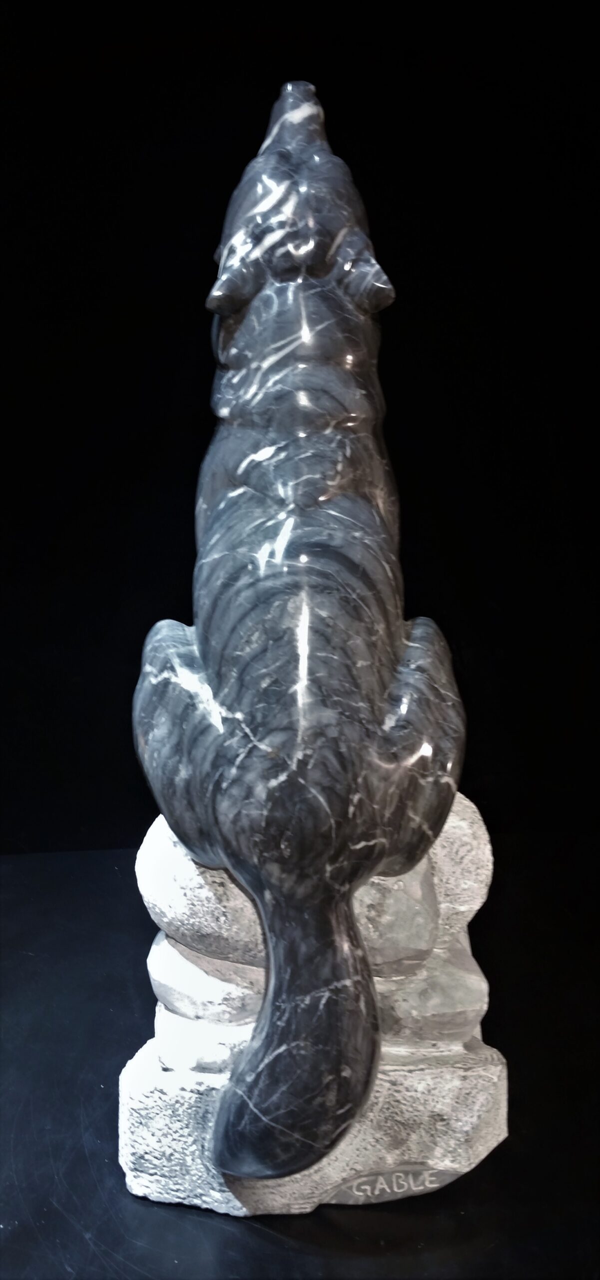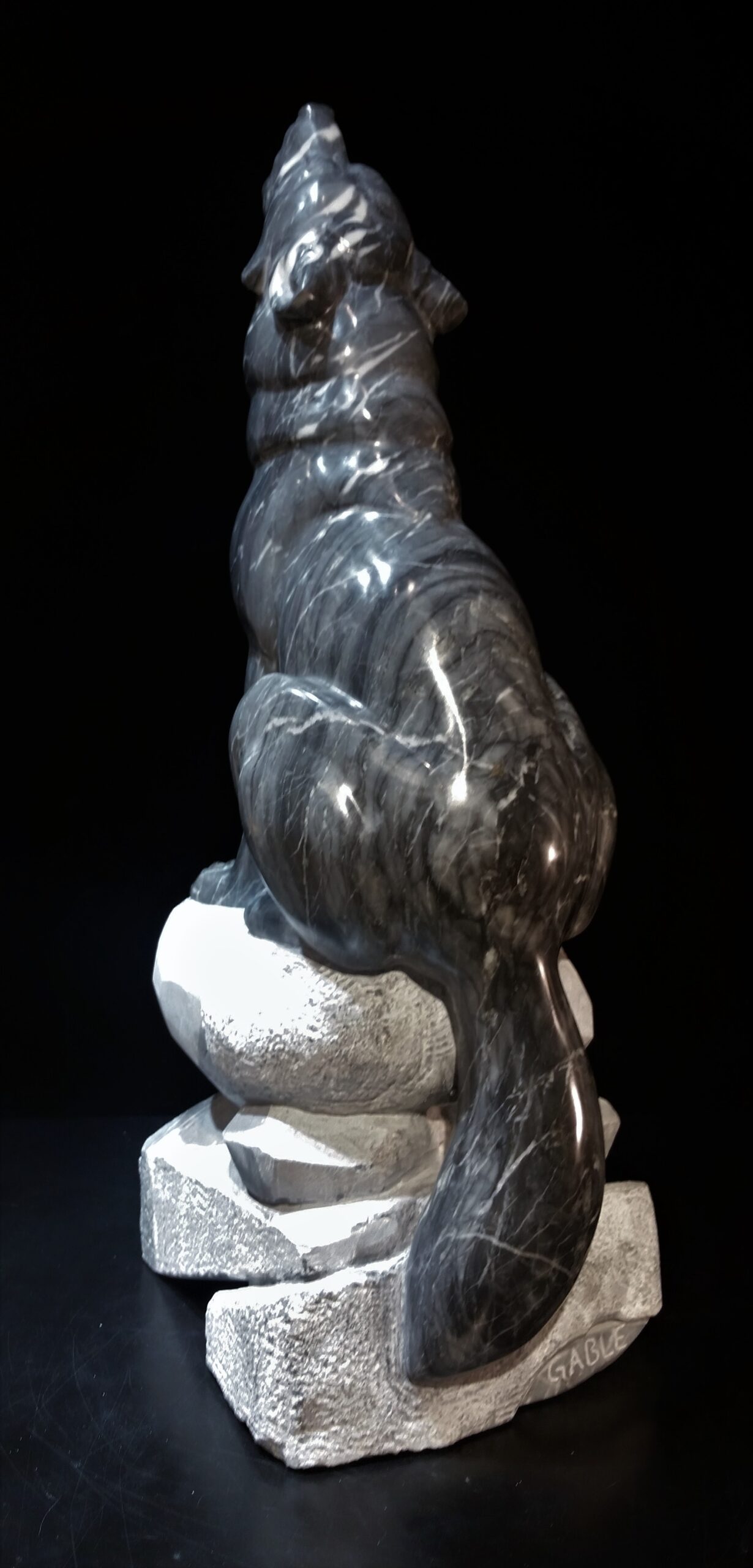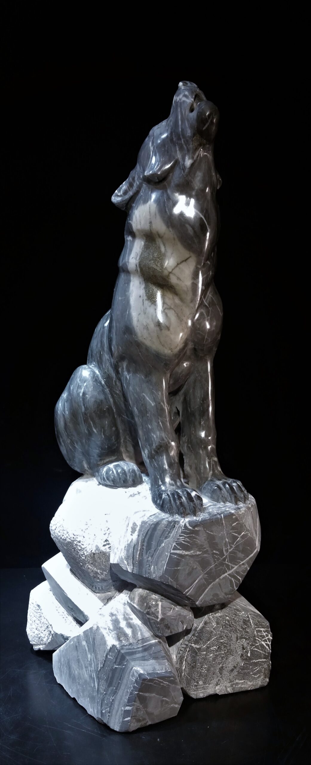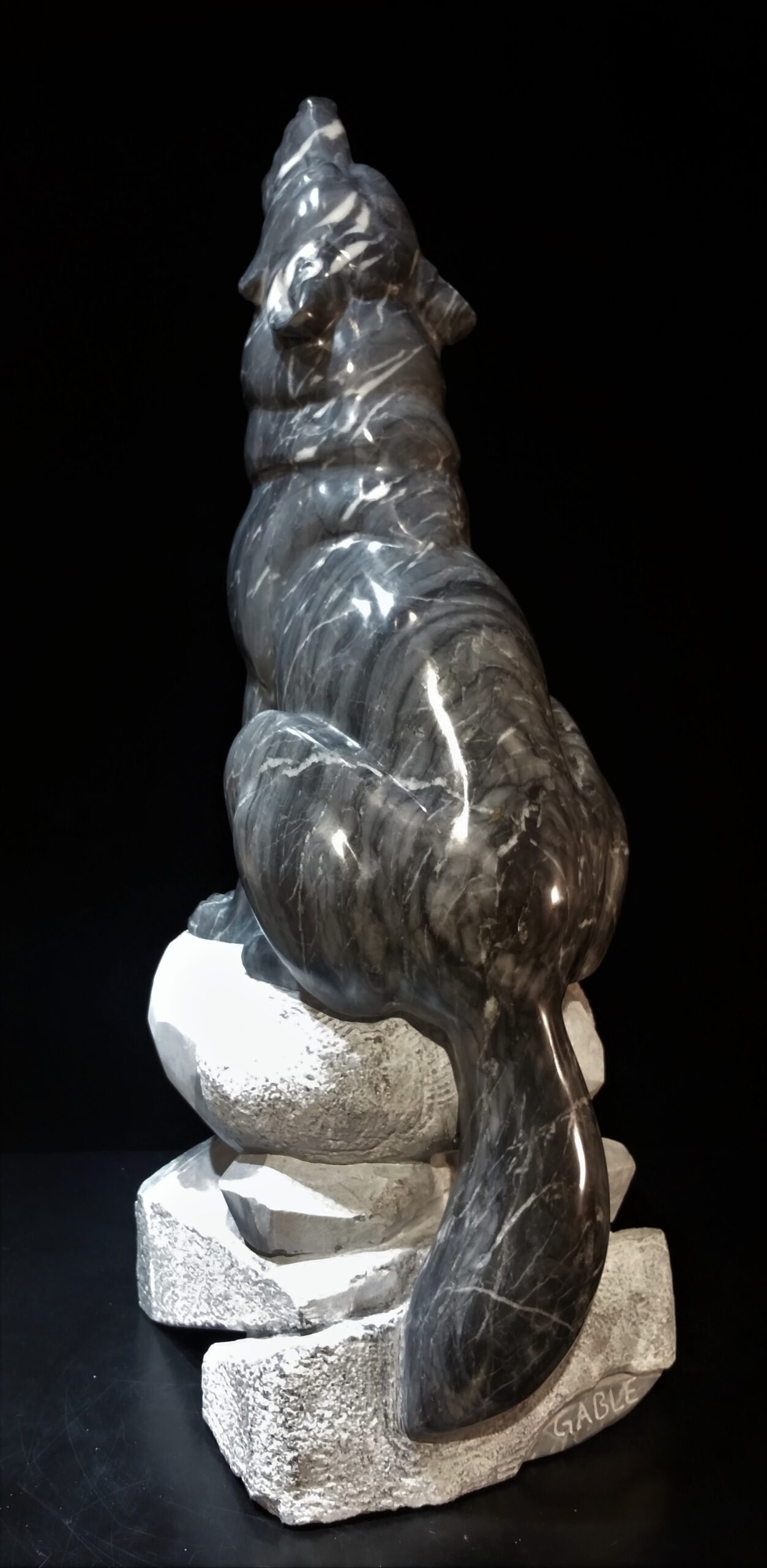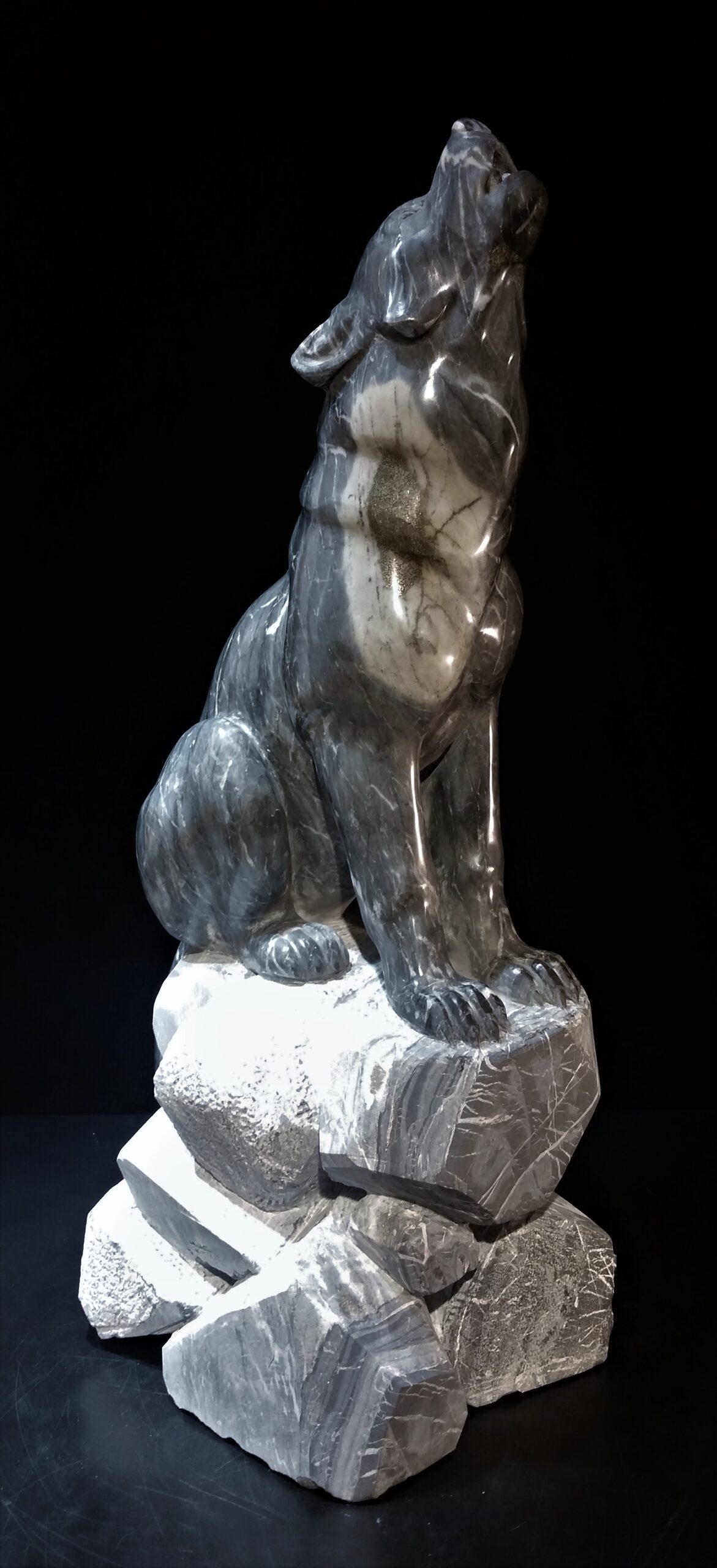 “Soul” is an Original Sculpture of a howling wolf carved out of a single block of Canadian Gray and Black Marble. This piece is one stone. The difference in color between the base and the wolf is achieved by leaving the base with a raw finish where the wolf itself was brought through 5 stages to standing/polishing to achieve the smooth finish revealing the natural black and gray color of the stone.