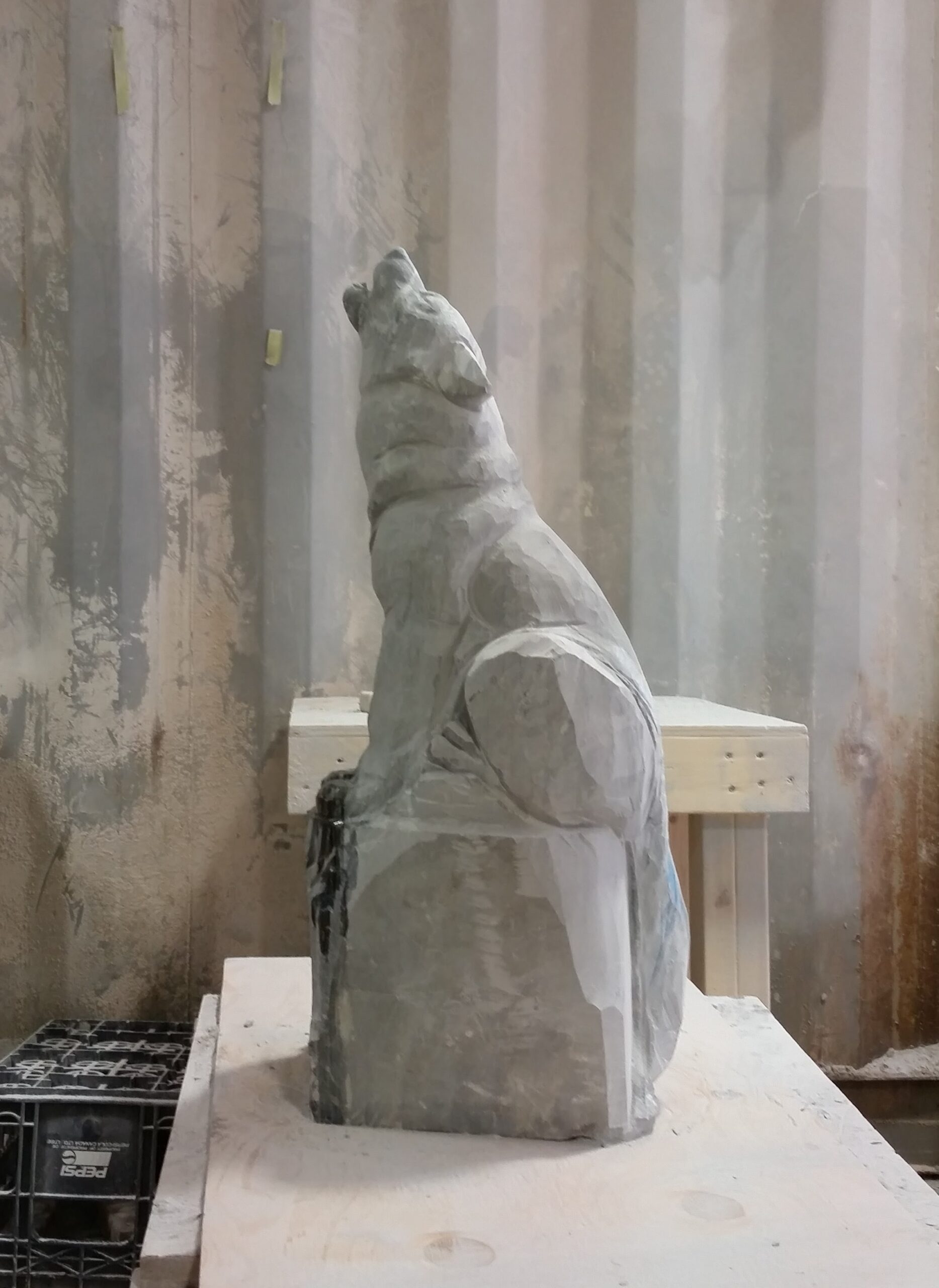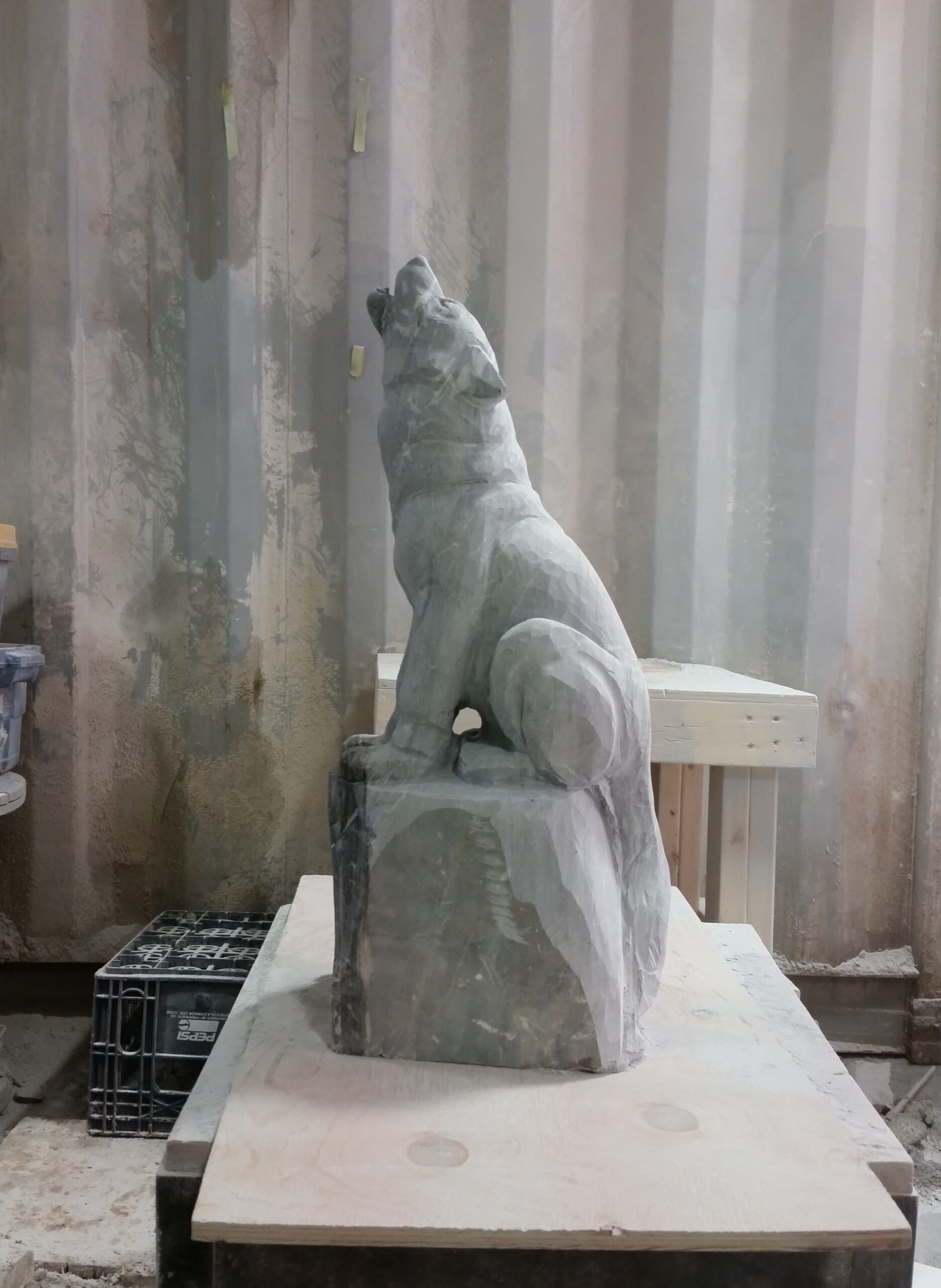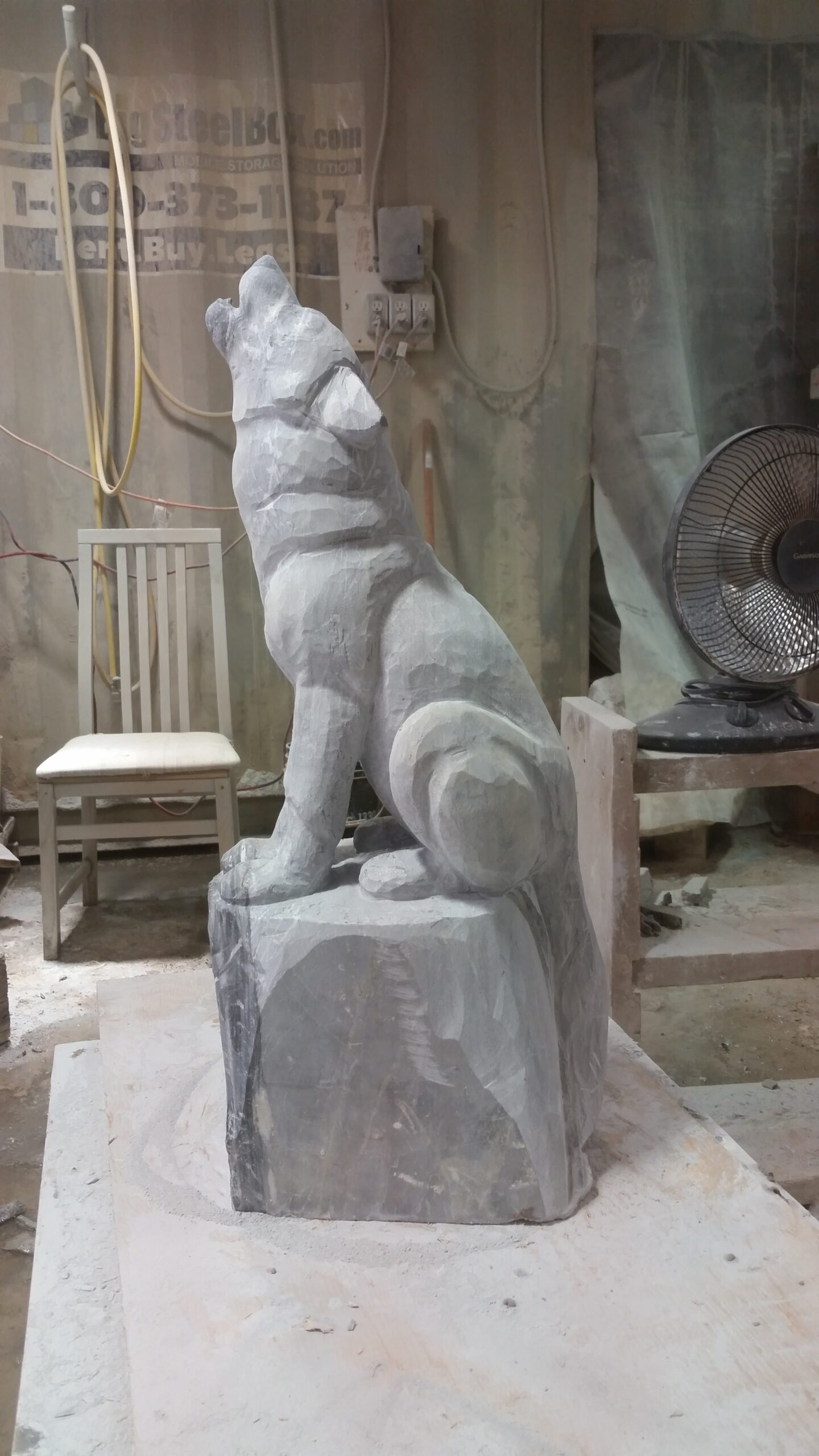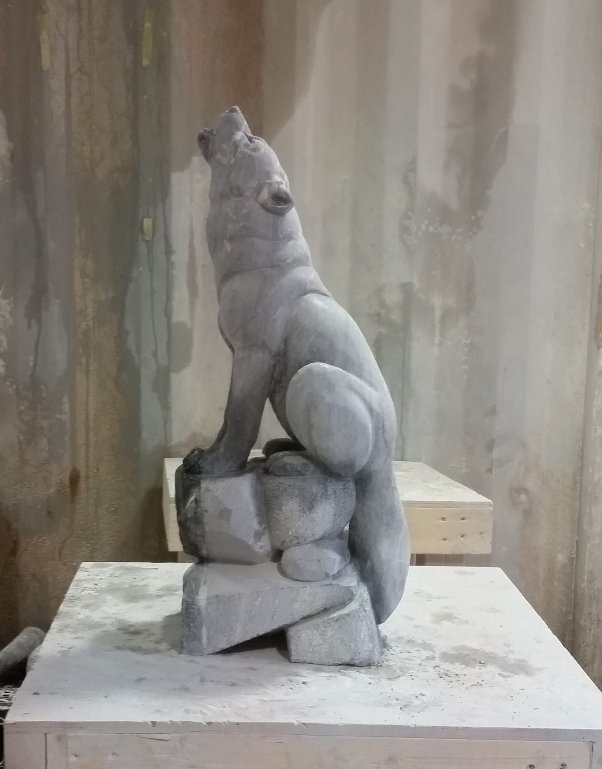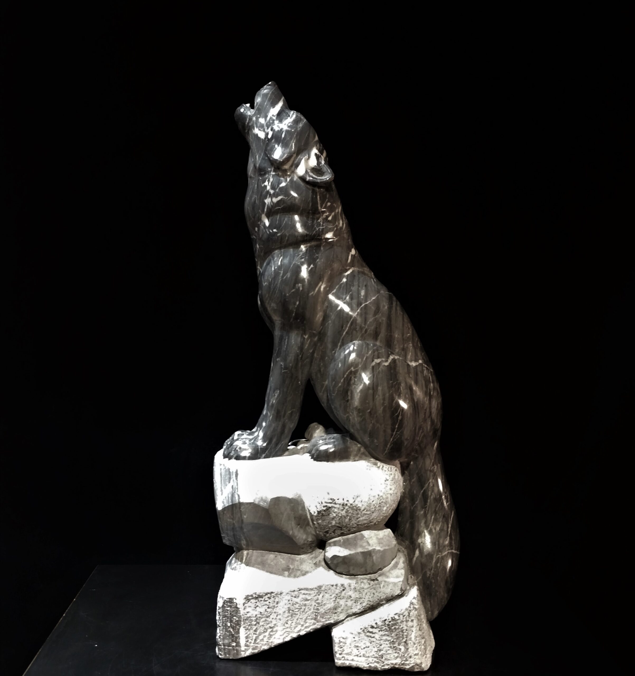 “Soul” is an Original Sculpture of a howling wolf carved out of a single block of Canadian Gray and Black Marble. This piece is one stone. The difference in color between the base and the wolf is achieved by leaving the base with a raw finish where the wolf itself was brought through 5 stages to standing/polishing to achieve the smooth finish revealing the natural black and gray color of the stone.