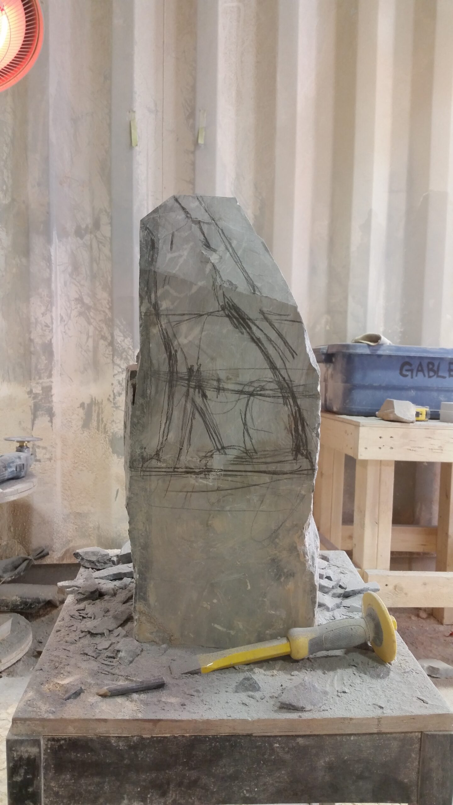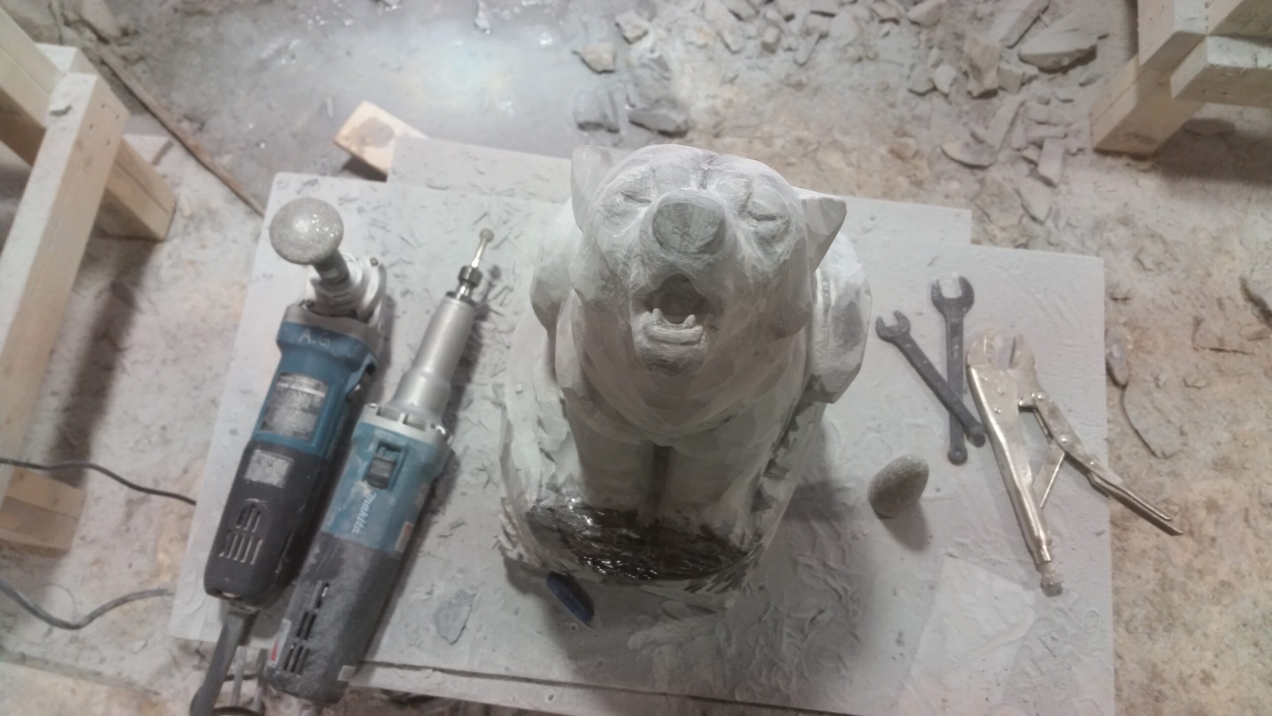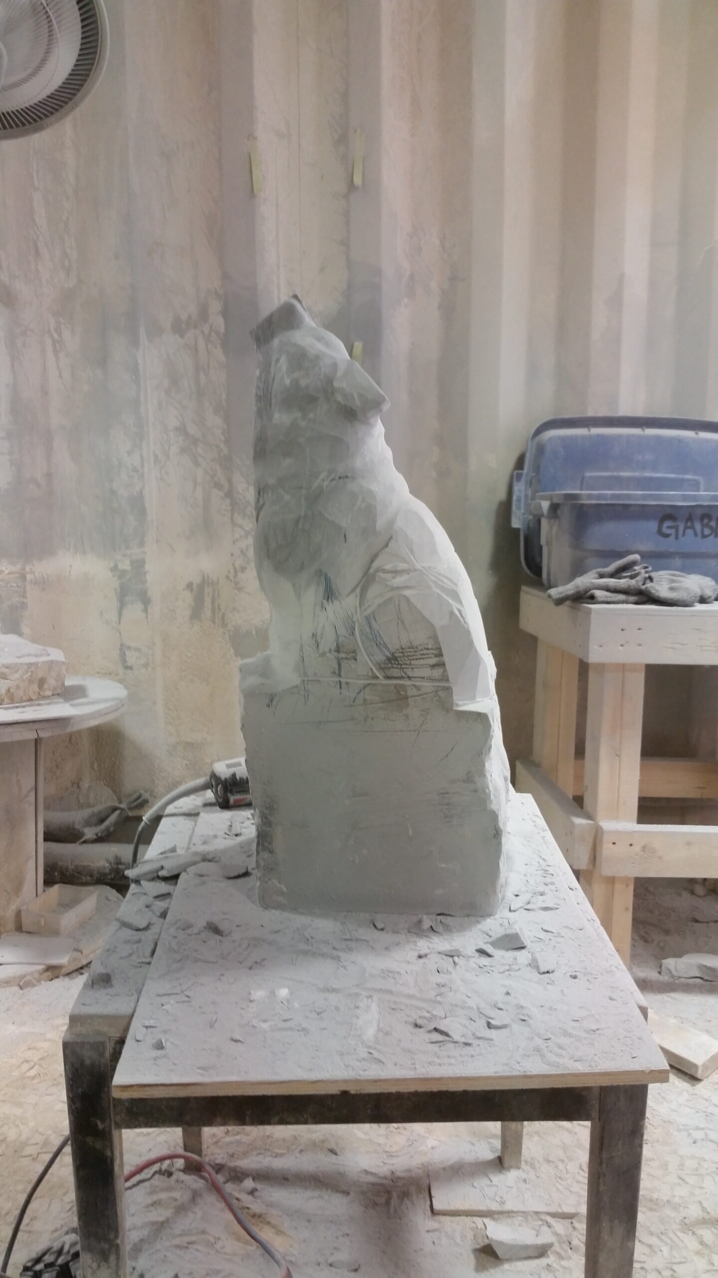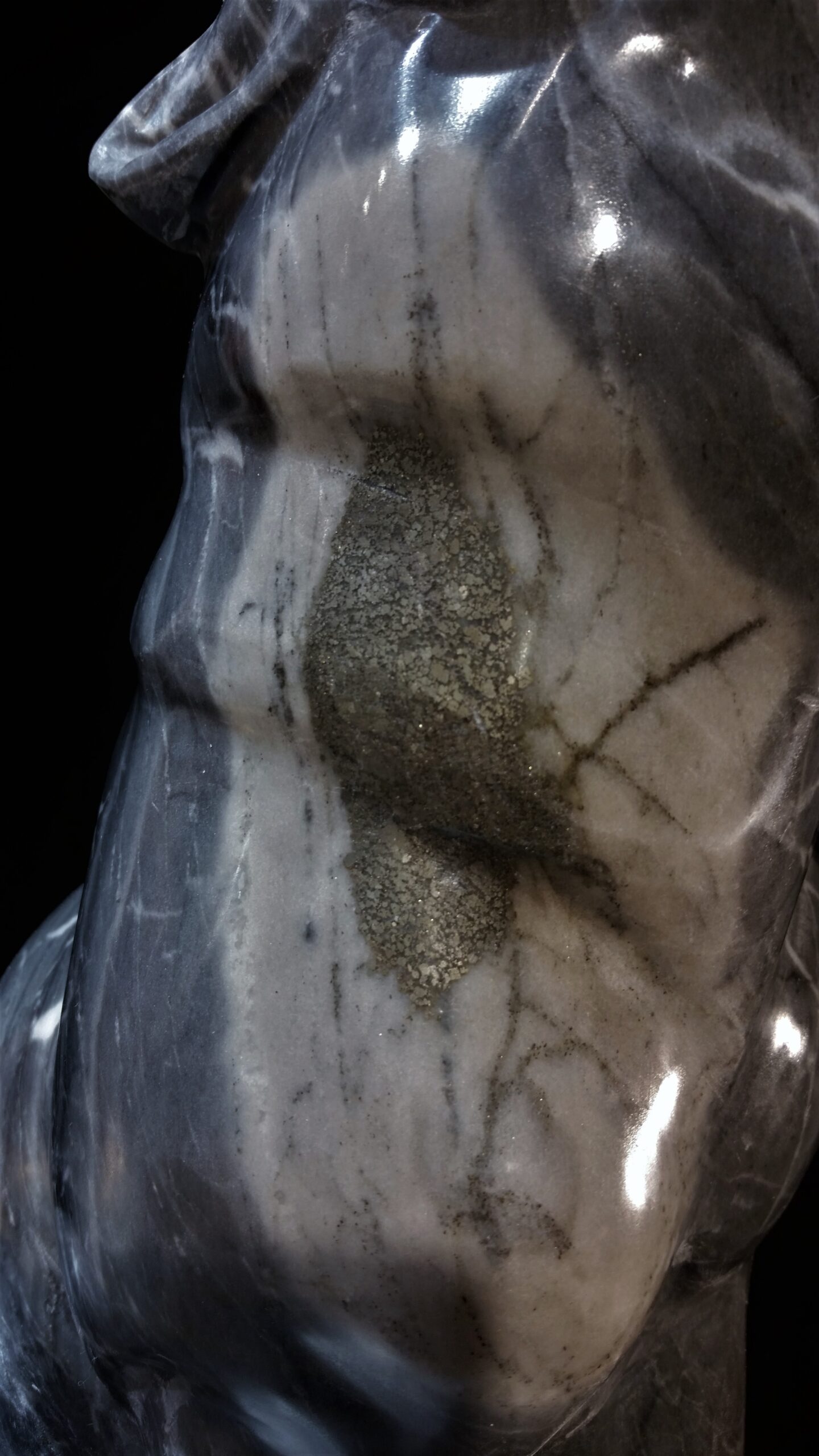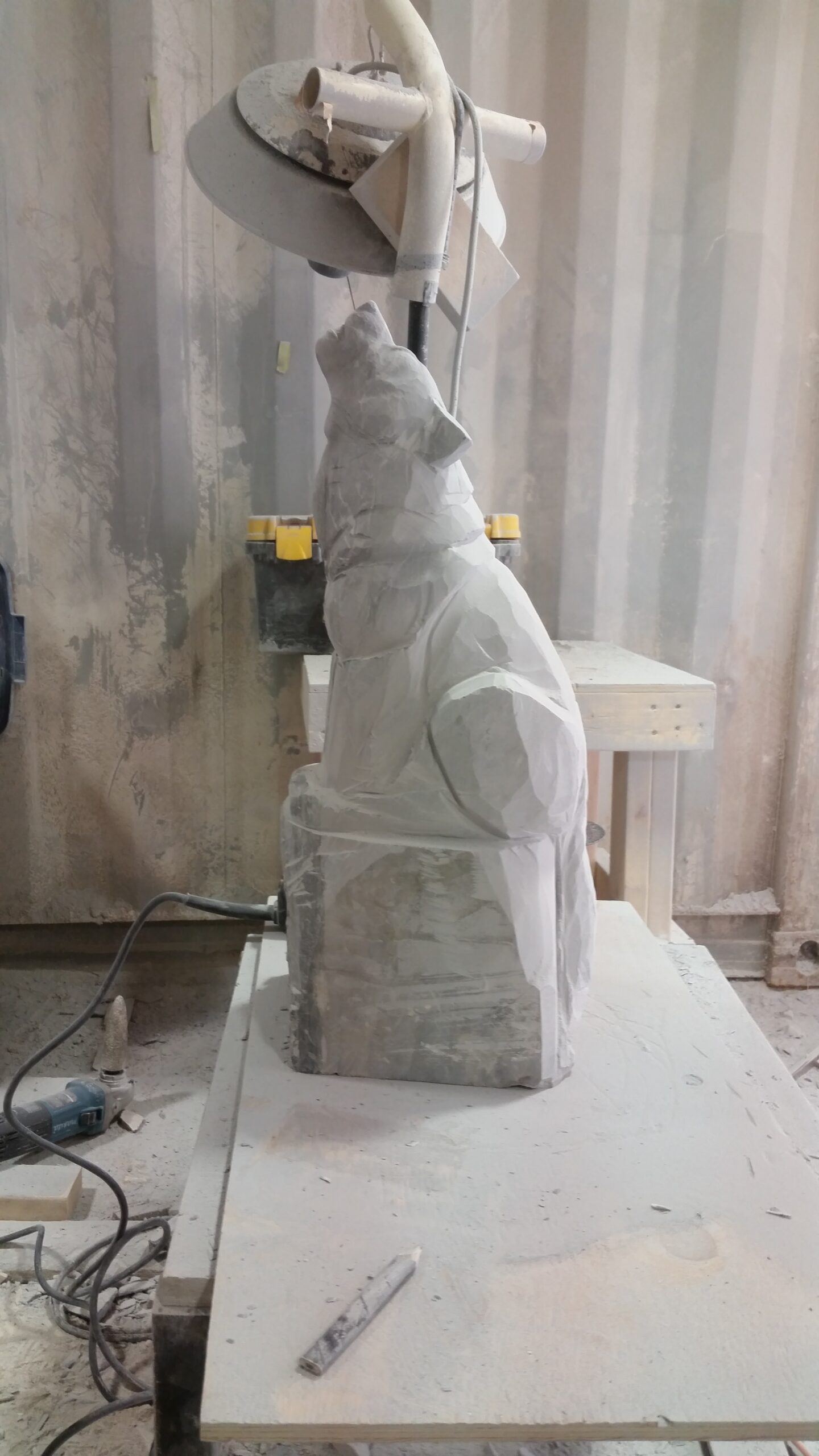 “Soul” is an Original Sculpture of a howling wolf carved out of a single block of Canadian Gray and Black Marble. This piece is one stone. The difference in color between the base and the wolf is achieved by leaving the base with a raw finish where the wolf itself was brought through 5 stages to standing/polishing to achieve the smooth finish revealing the natural black and gray color of the stone.