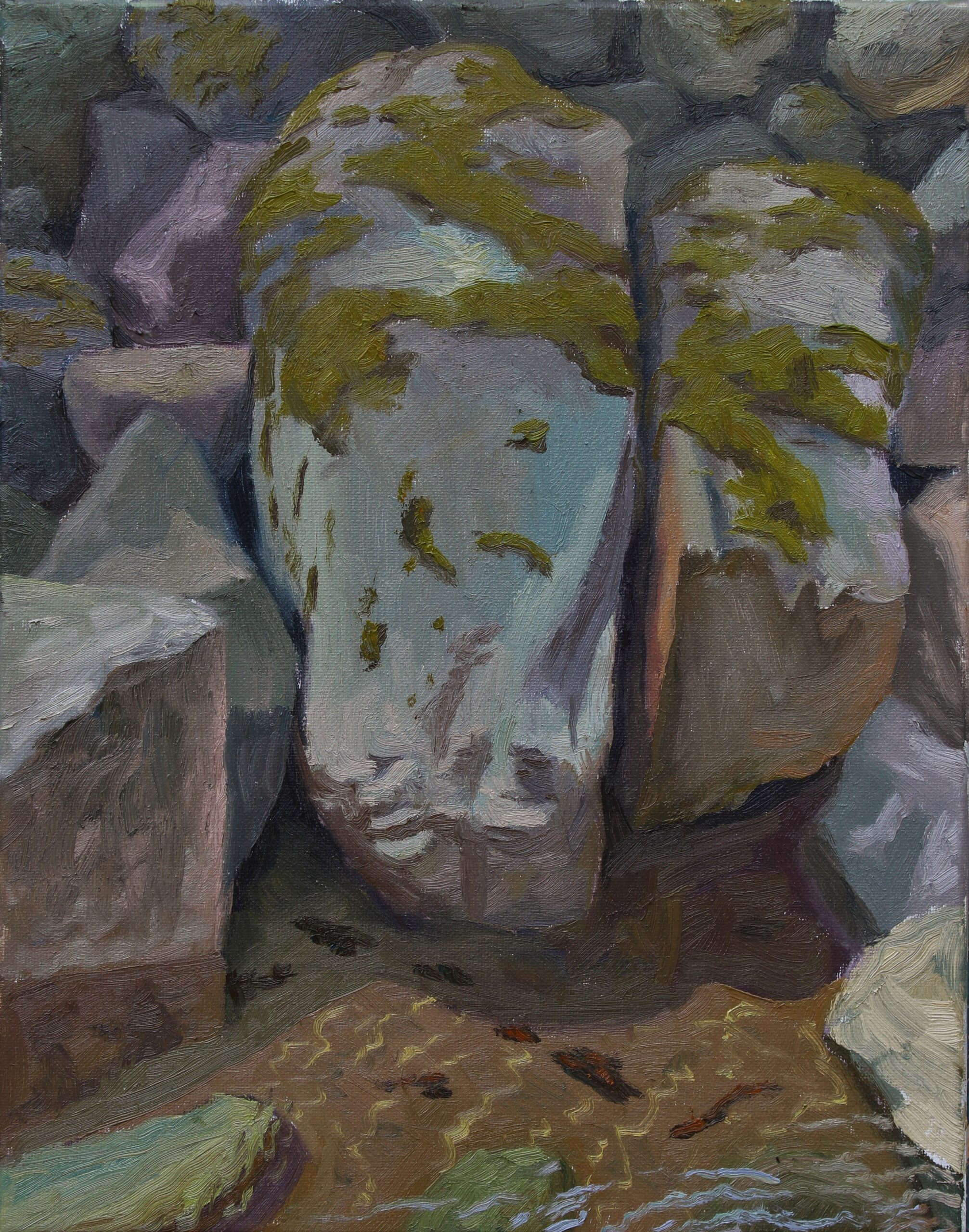 This is an Original Plein Air Painting of boulders on the edge of a river. Painted in Squamish BC, Canada